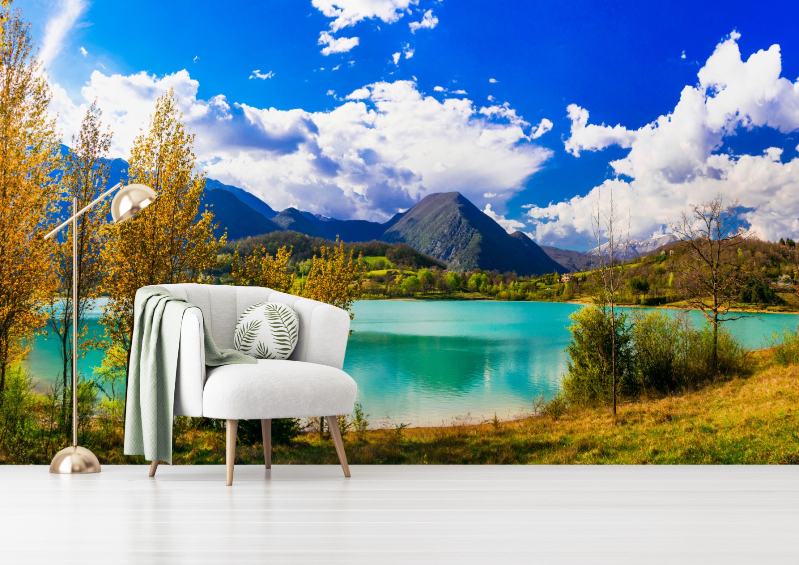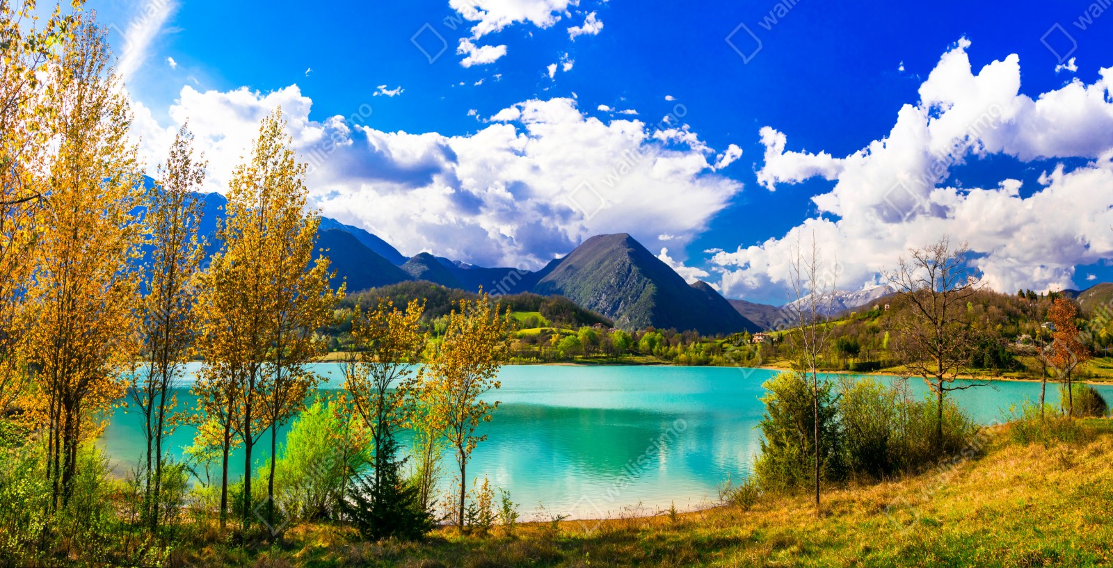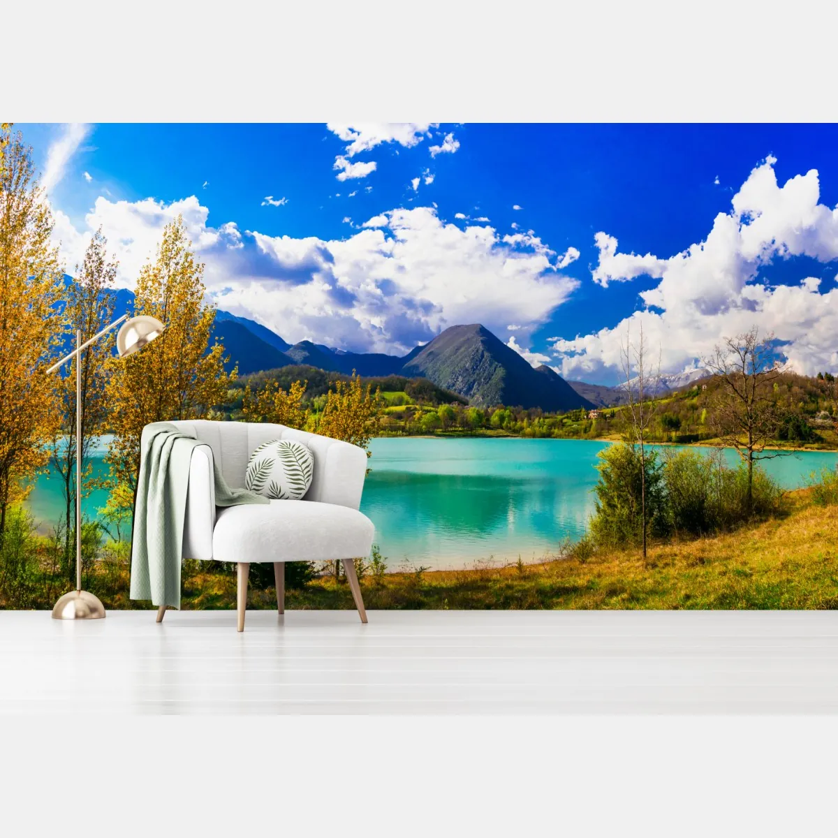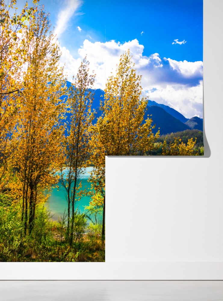 lebendiger türkissee eingerahmt von goldenen bäumen und dramatischen bergen, ideal um natürliche ruhe in ihr zuhause zu bringen.