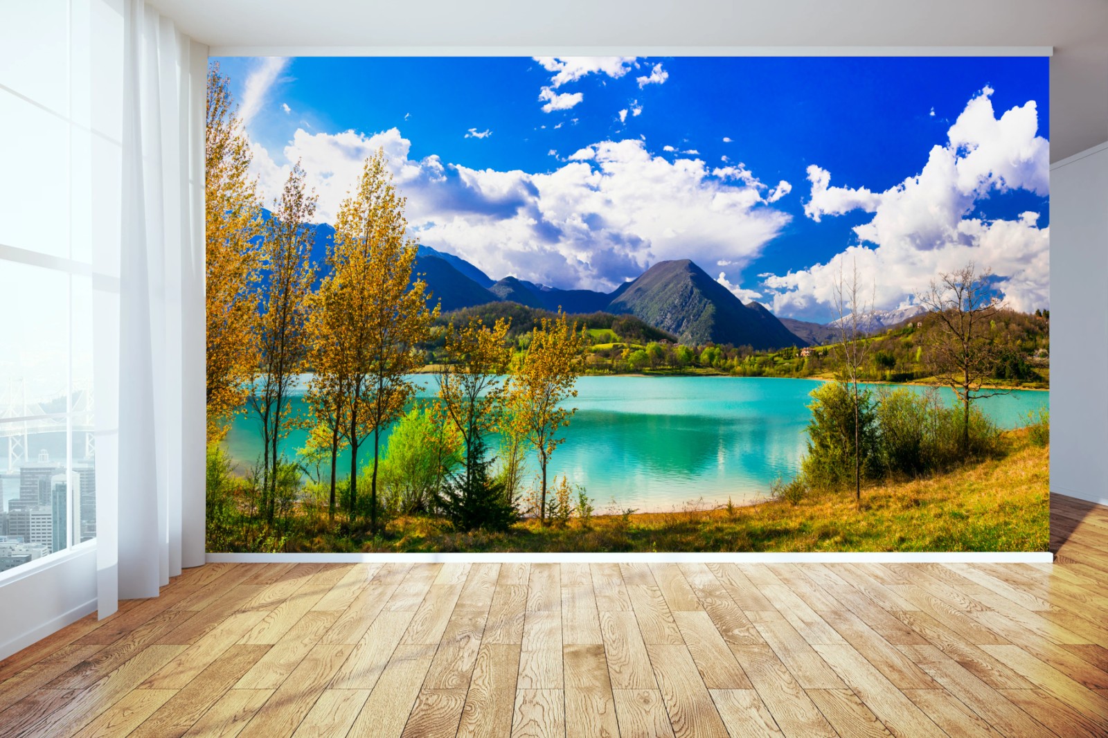 lebendiger türkissee eingerahmt von goldenen bäumen und dramatischen bergen, ideal um natürliche ruhe in ihr zuhause zu bringen.MehrWeniger