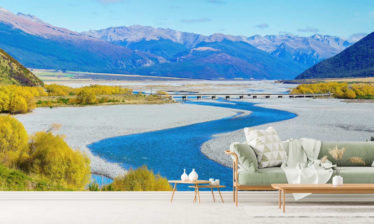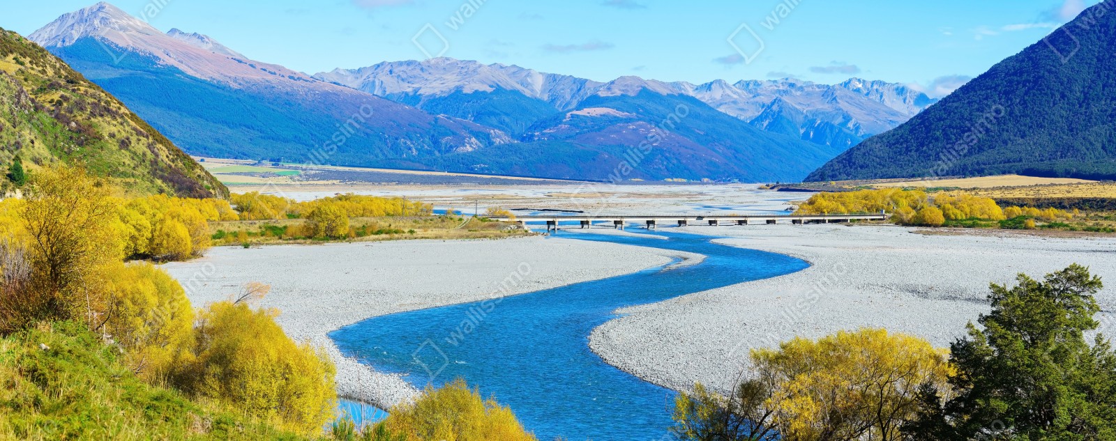 Erleben Sie die wilde Schönheit von Arthur's Pass in diesem herbstlichen Panoramabild mit einem gewundenen blauen Fluss, goldenen Bäumen und majestätischen Bergen.