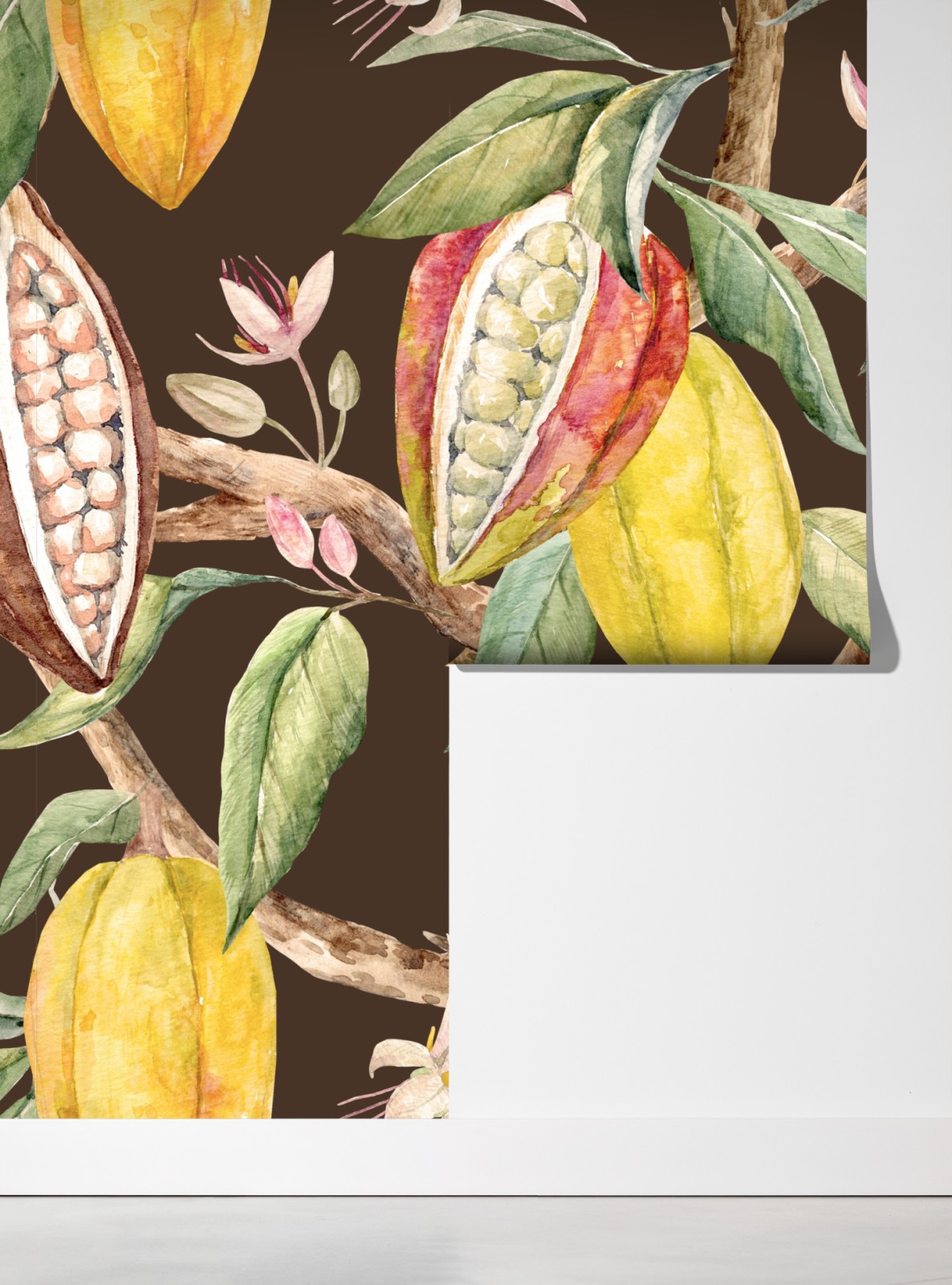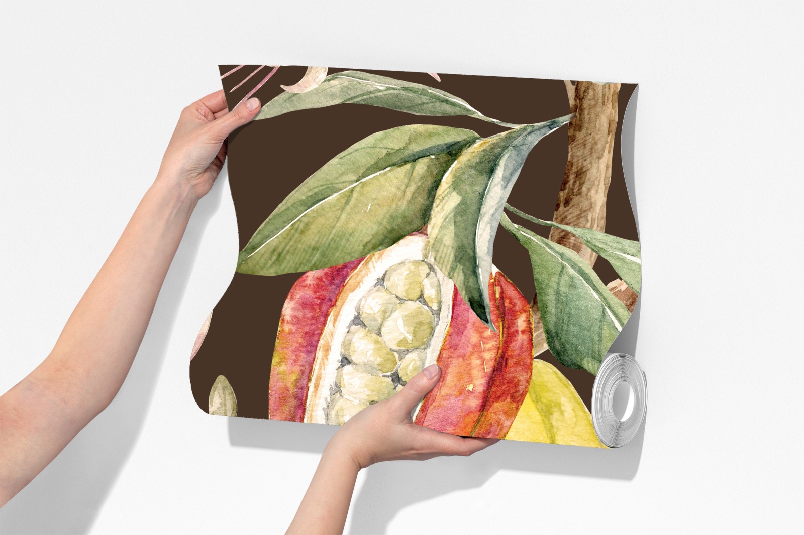 Handgezeichnete Aquarell-Kakaofrüchte und üppige Blätter schaffen ein warmes tropisches Muster, das jedem Raum natürliche Ausstrahlung verleiht.