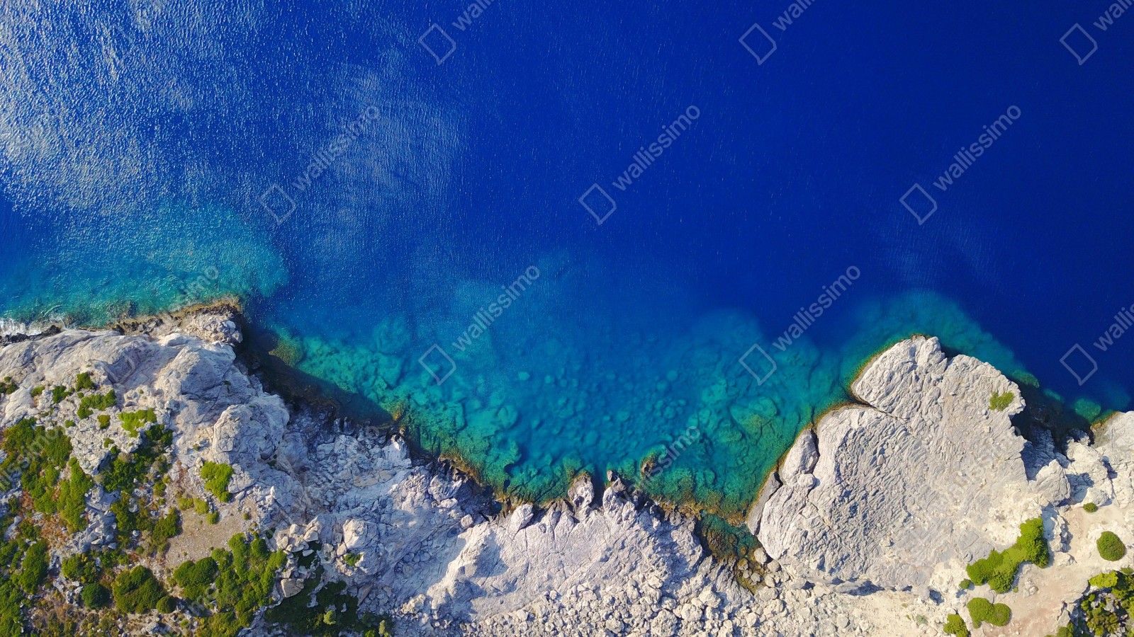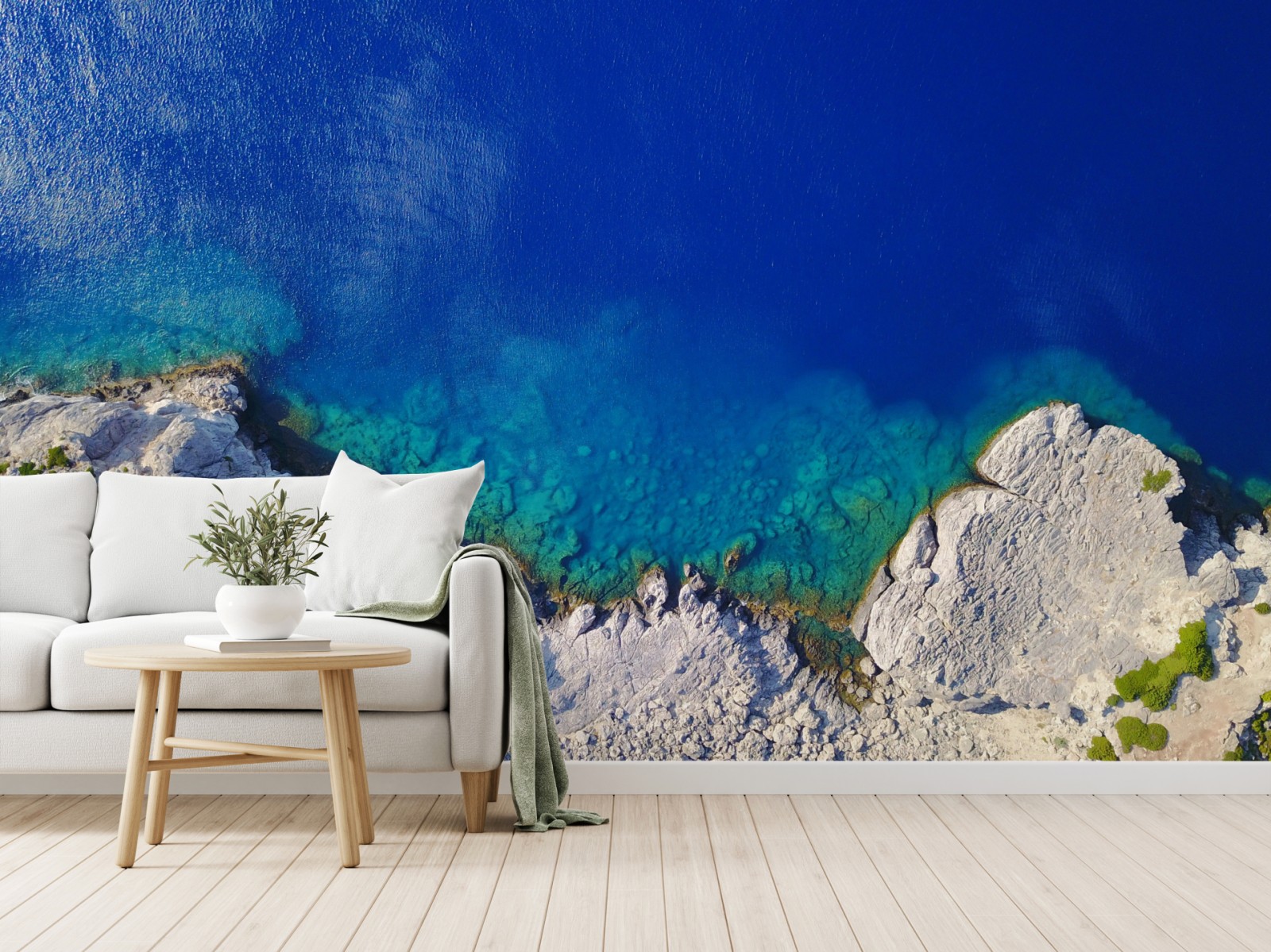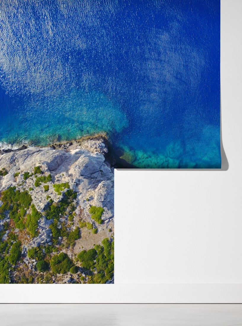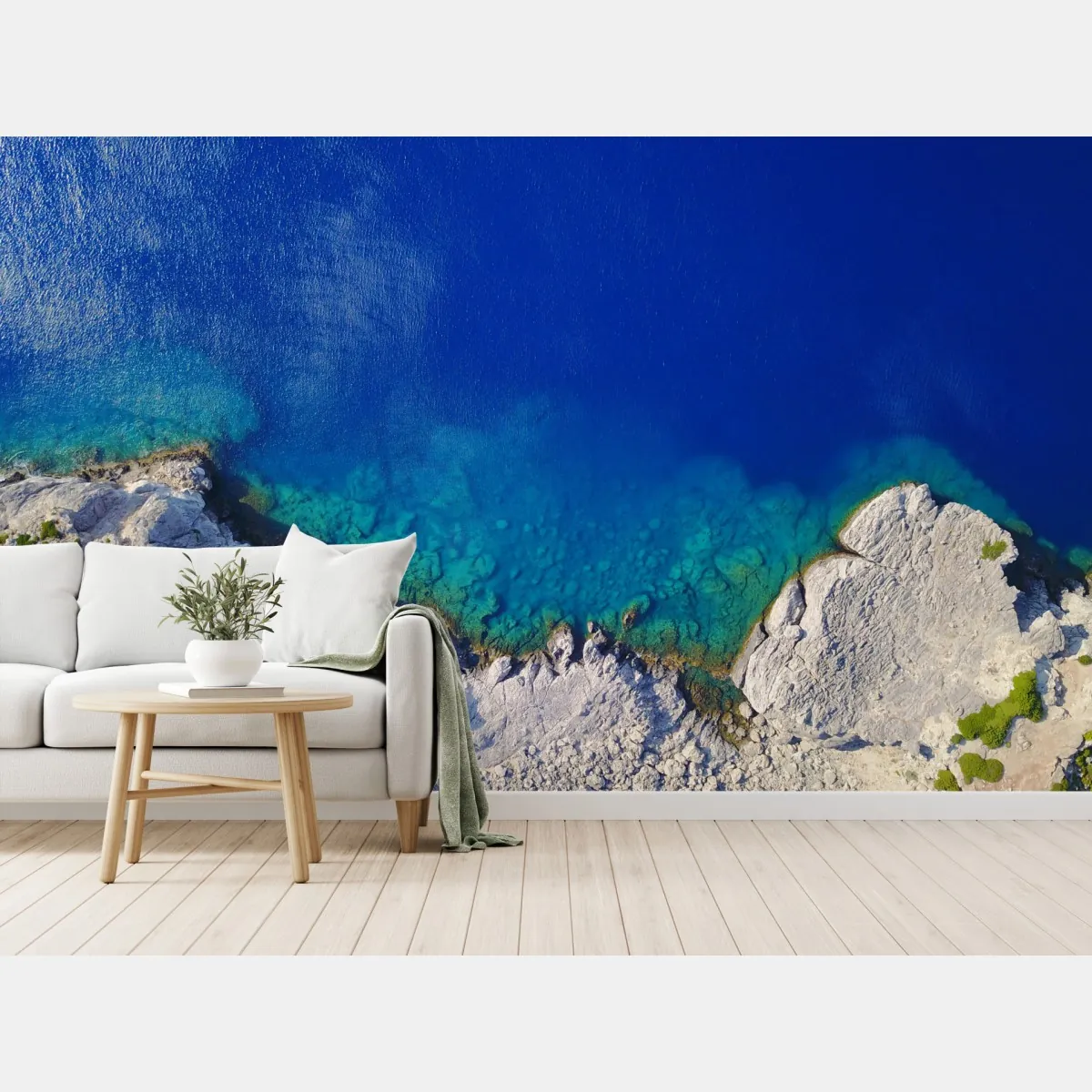 Beeindruckende Luftaufnahme einer felsigen Küste und des tiefblauen Meeres, die Ruhe und maritimes Flair in jeden Raum bringt.