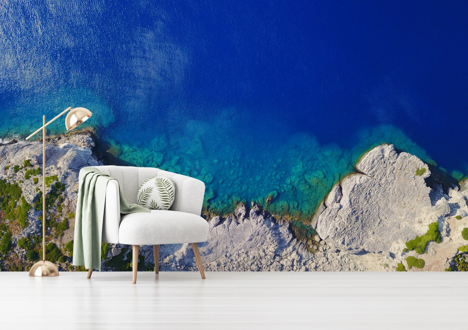 Beeindruckende Luftaufnahme einer felsigen Küste und des tiefblauen Meeres, die Ruhe und maritimes Flair in jeden Raum bringt.MehrWeniger