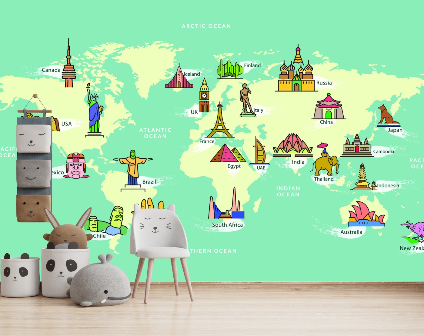 Fototapete Bunte illustrierte weltkarte mit sehenswürdigkeiten
