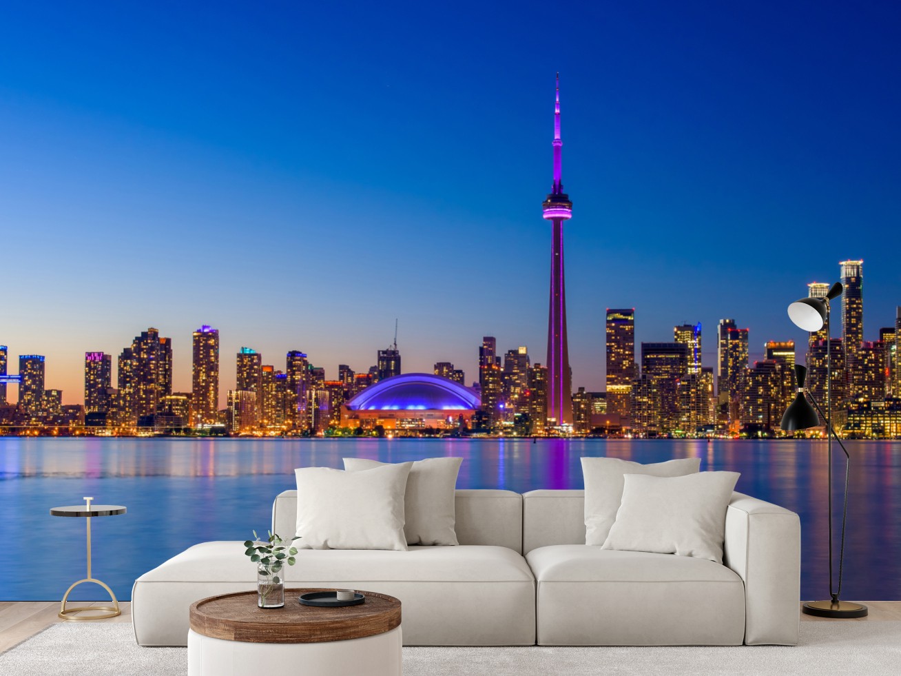 Atemberaubende panoramaansicht der beleuchteten skyline von Toronto bei dämmerung mit reflexionen im ruhigen wasser, ideal für moderne innenräume und urbane dekoration.
