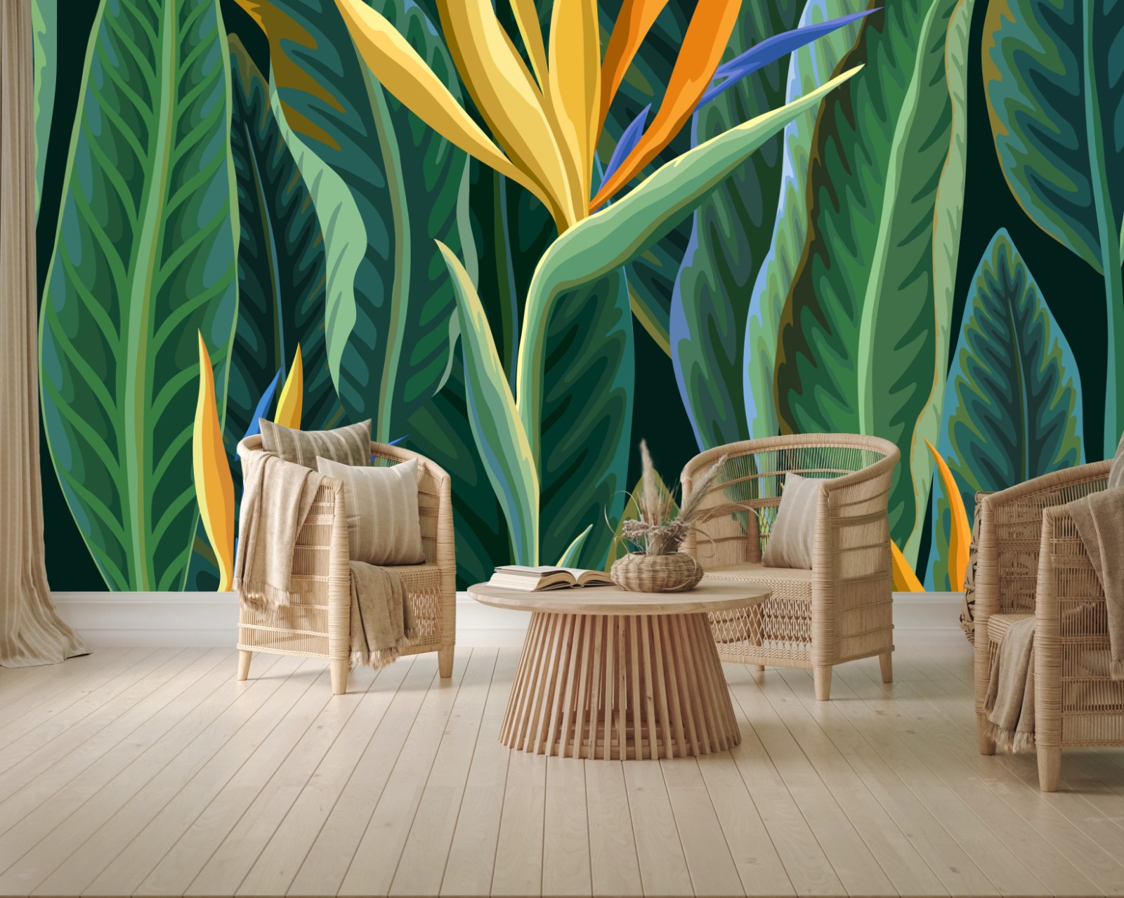 Fototapete Tropische illustration mit strelitzie und üppigen blättern