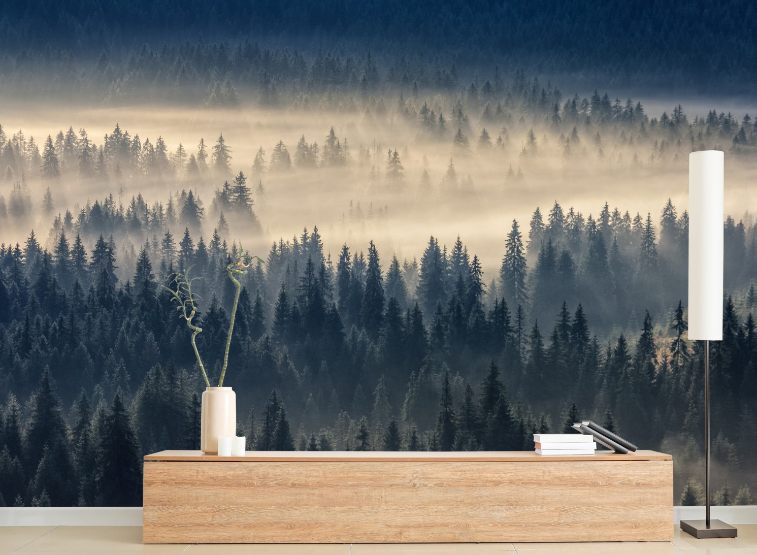 Ein ruhiger, nebelverhangener Fichtenwald, durchzogen von morgendlichen Sonnenstrahlen, ideal, um Tiefe und Ruhe an Ihre Wände zu bringen.MehrWeniger