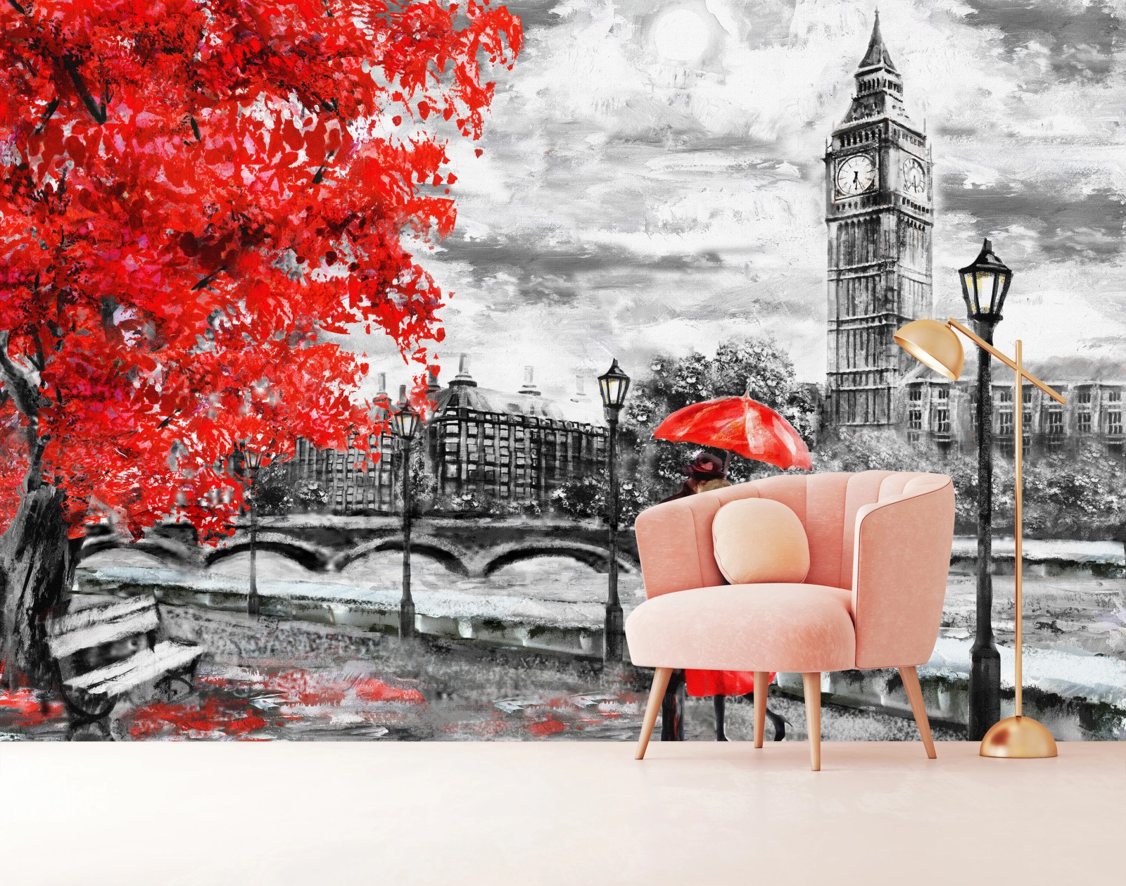 Dramatisches ölgemälde eines paares unter einem roten regenschirm am Fluss mit dem Big Ben im Hintergrund, das romantischen Vintage-Charme in Ihr Zuhause bringt.MehrWeniger