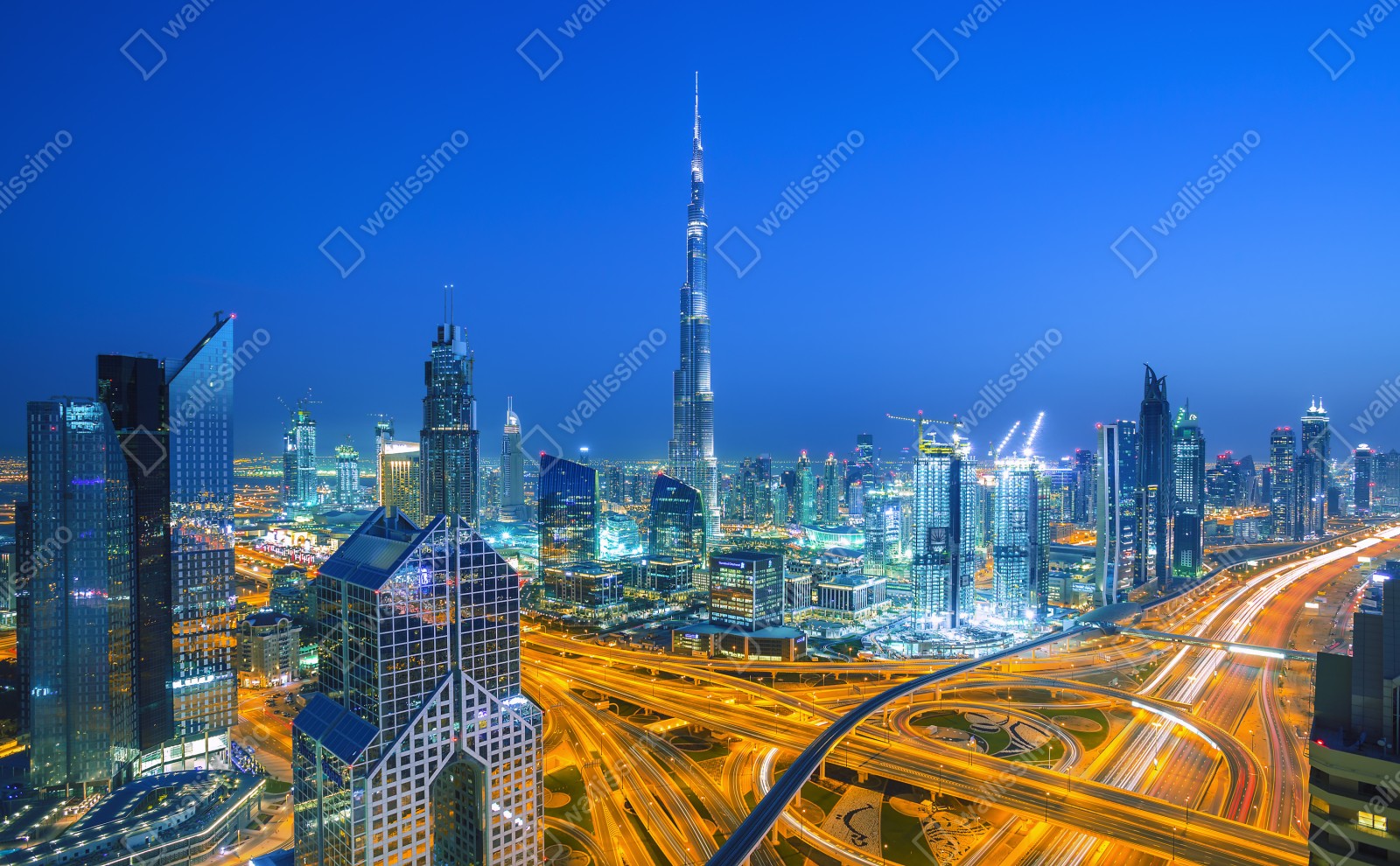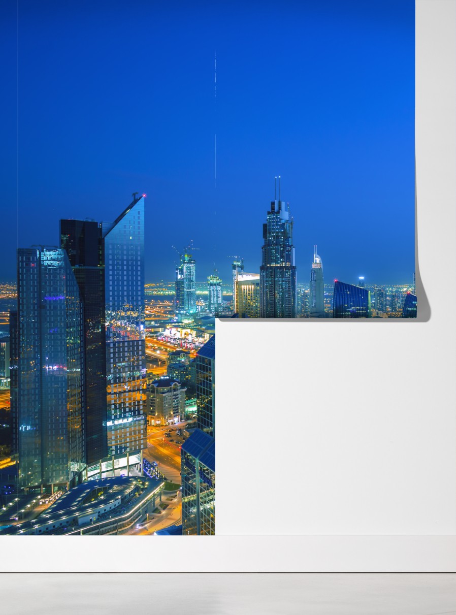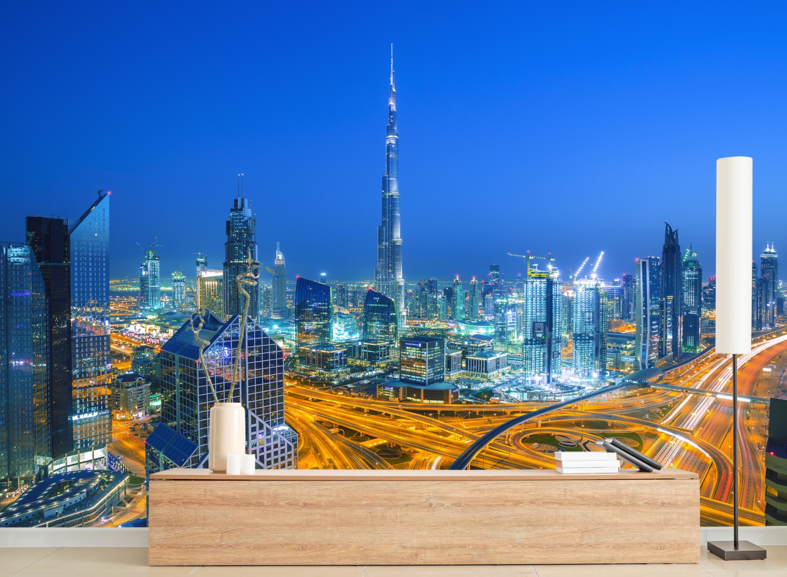 Atemberaubender Luftblick auf Dubais beleuchtete Skyline und geschwungene Autobahnen verleiht jedem Raum urbane, moderne Atmosphäre.