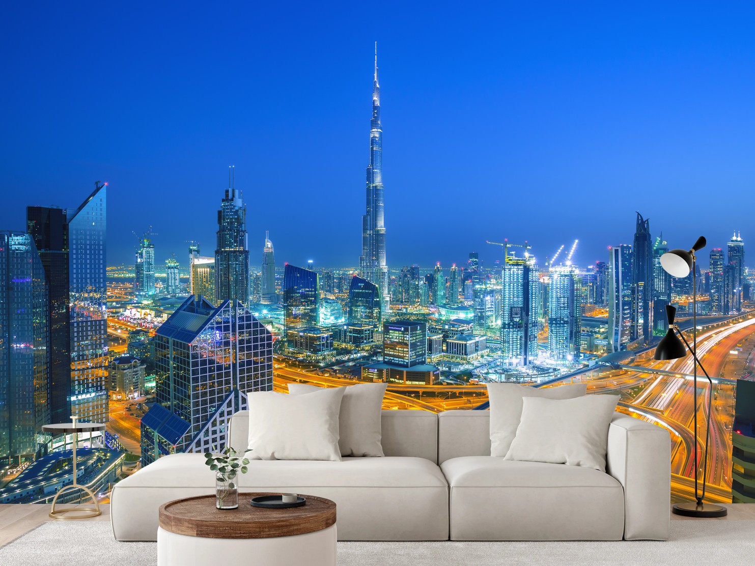 Atemberaubender Luftblick auf Dubais beleuchtete Skyline und geschwungene Autobahnen verleiht jedem Raum urbane, moderne Atmosphäre.MehrWeniger