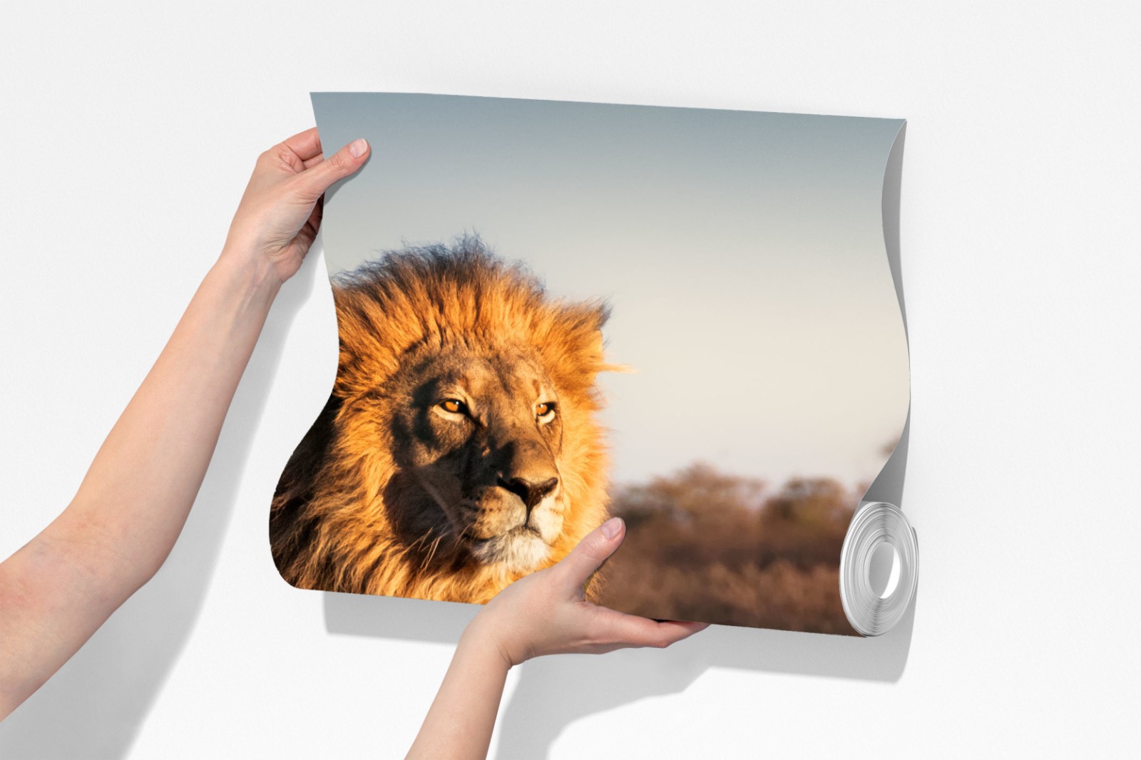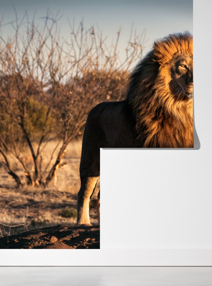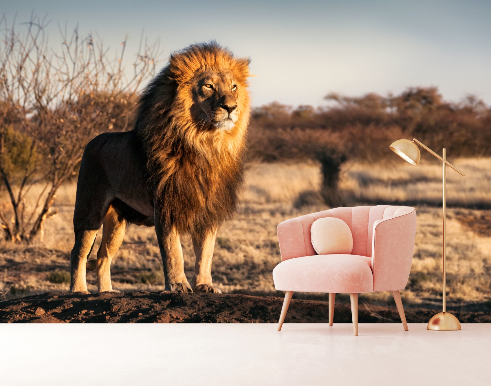 Ein eindrucksvolles Porträt eines majestätischen Löwen, der stolz auf einem Hügel steht und jedem Raum wilde Erhabenheit und Wärme verleiht.