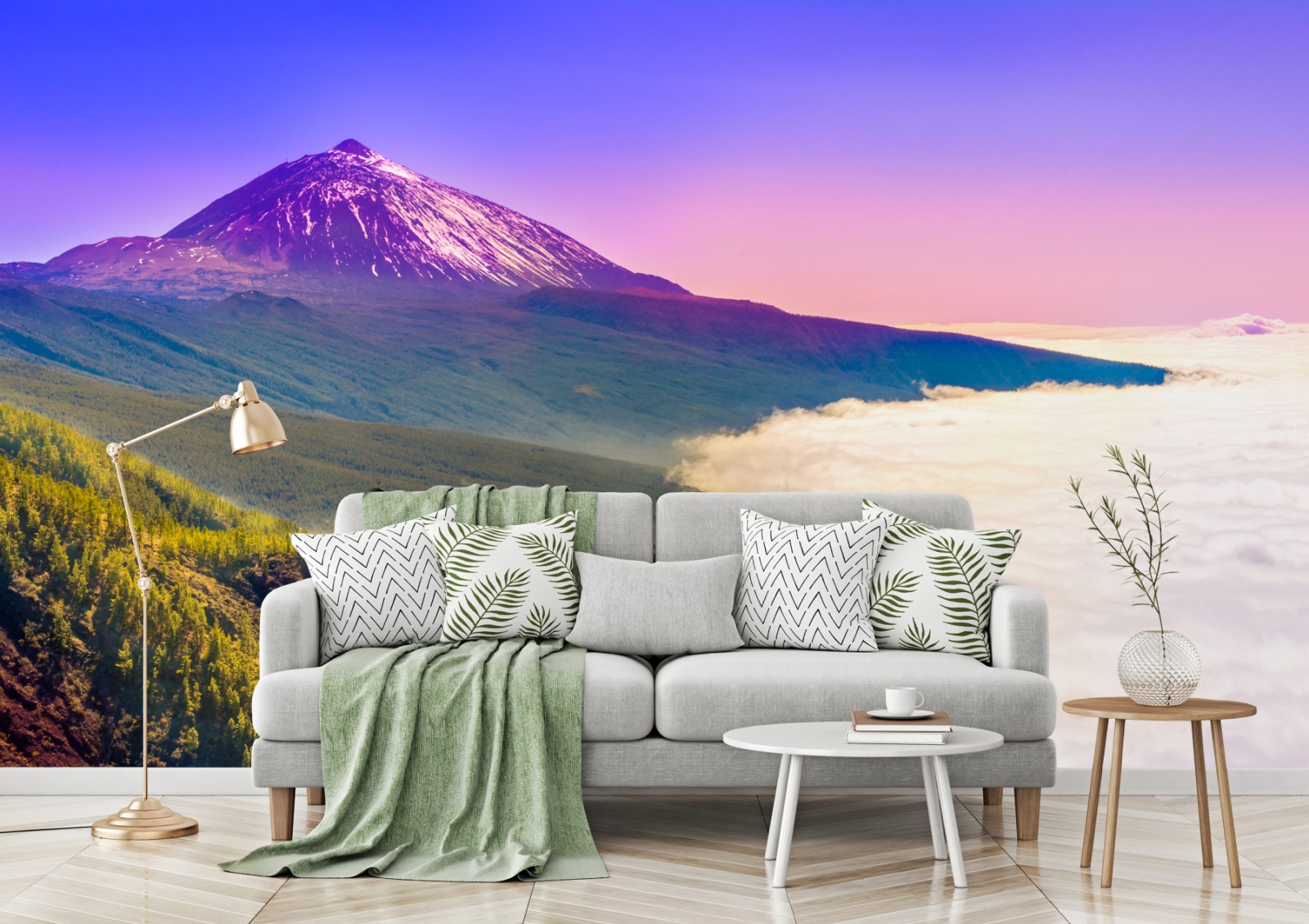 Beeindruckende Panoramaaufnahme des Vulkans Teide über den Wolken bei Sonnenaufgang, die Ruhe und natürliche Schönheit an jede Wand bringt.