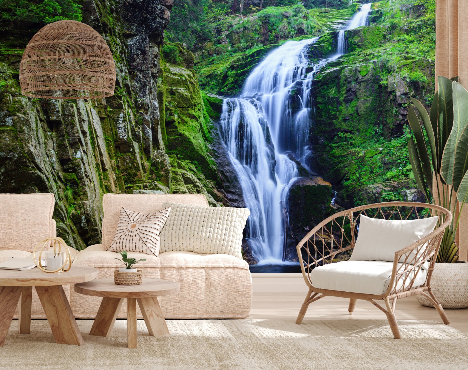 Panoramablick auf den Wasserfall Kamienczyk, der über moosbedeckte Felsen fließt und jedem Raum natürliche Ruhe verleiht.