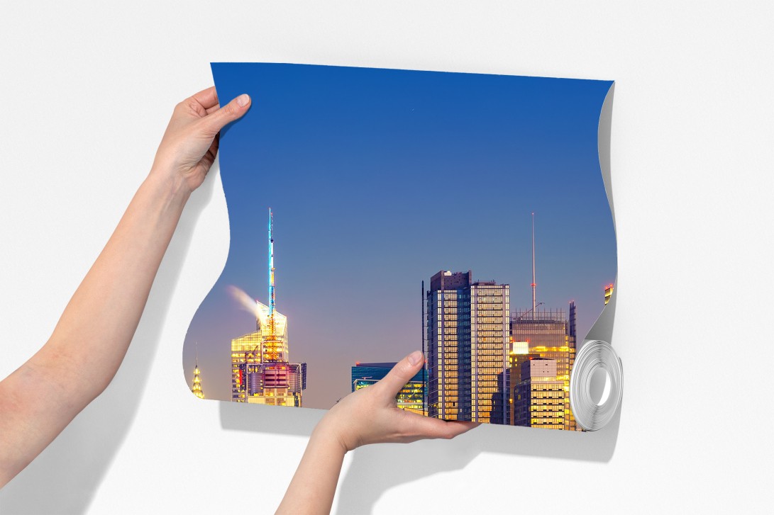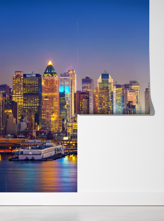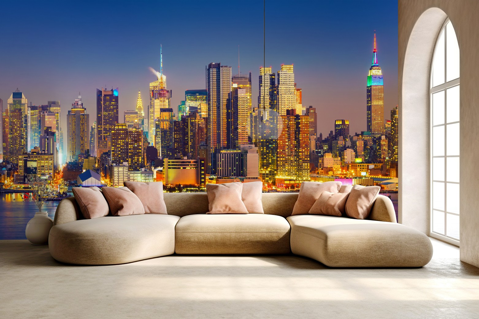 Lebendige Panoramaaufnahme von Manhattan bei Dämmerung mit funkelnden Stadtlichtern, die sich im Wasser spiegeln, ideal zur Aufwertung von Innenräumen.