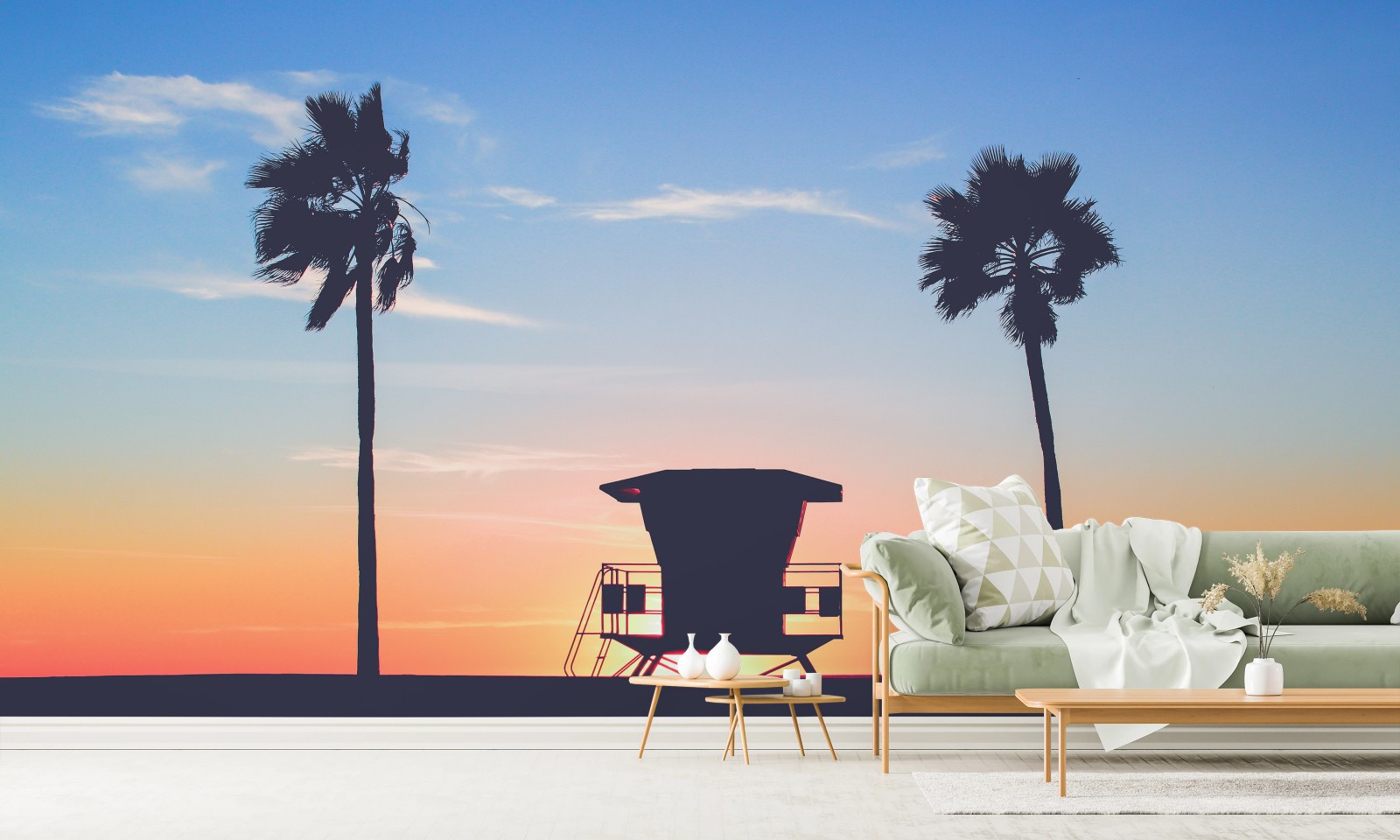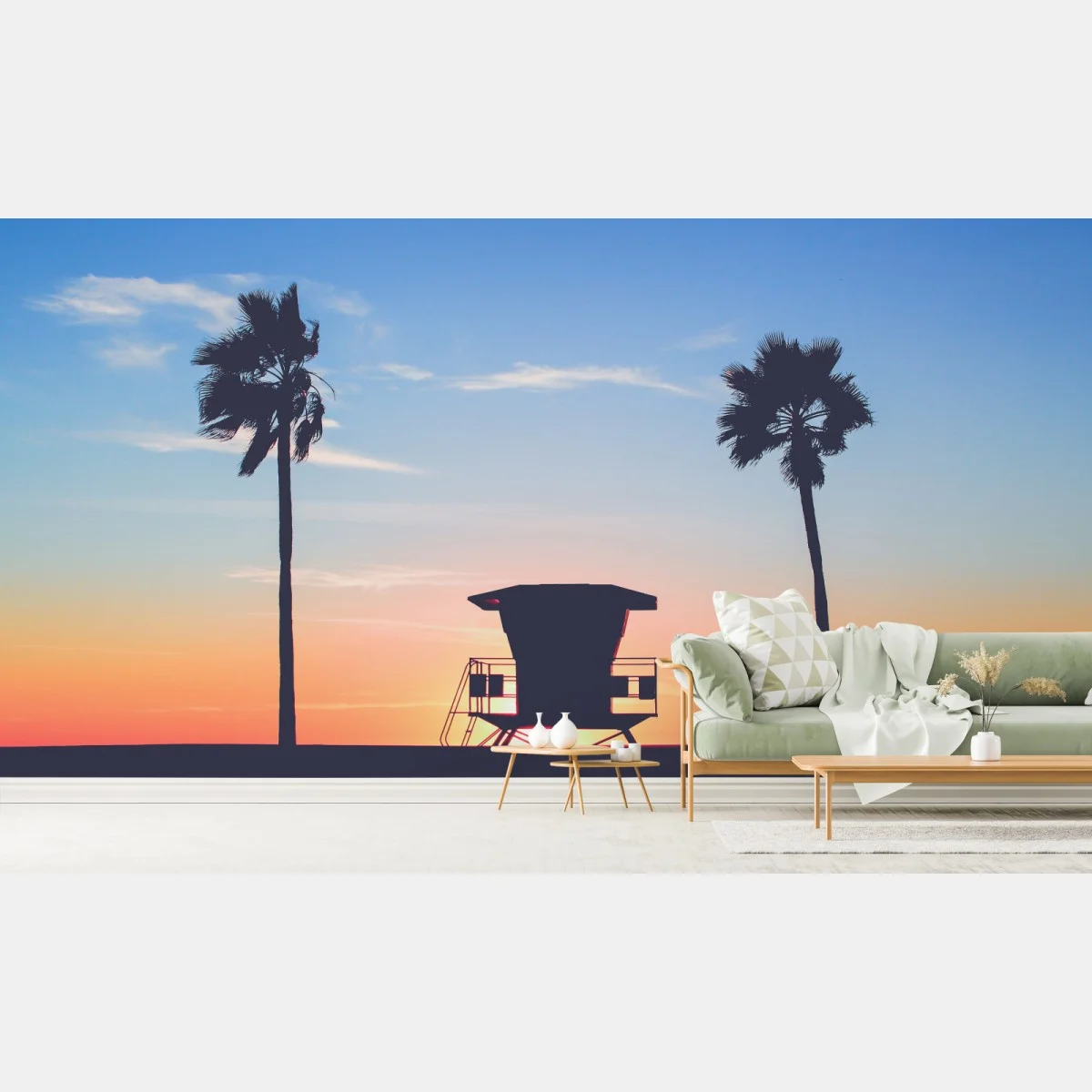 Fototapete Sonnenuntergang am strand mit palmen und rettungsturm