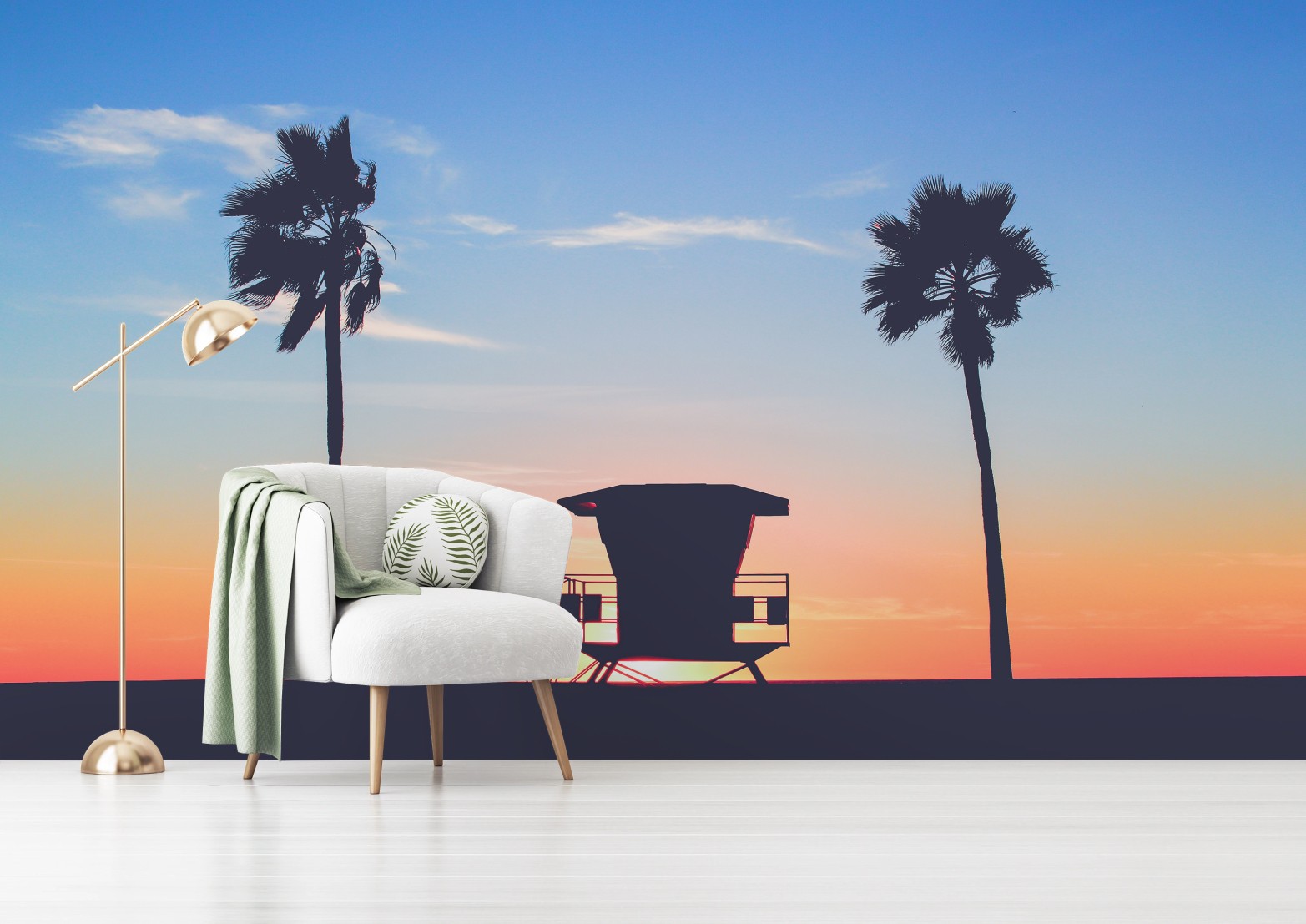 Fototapete Sonnenuntergang am strand mit palmen und rettungsturm