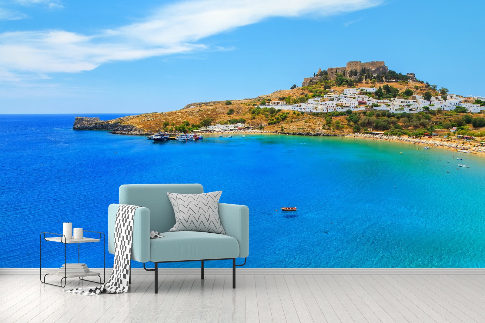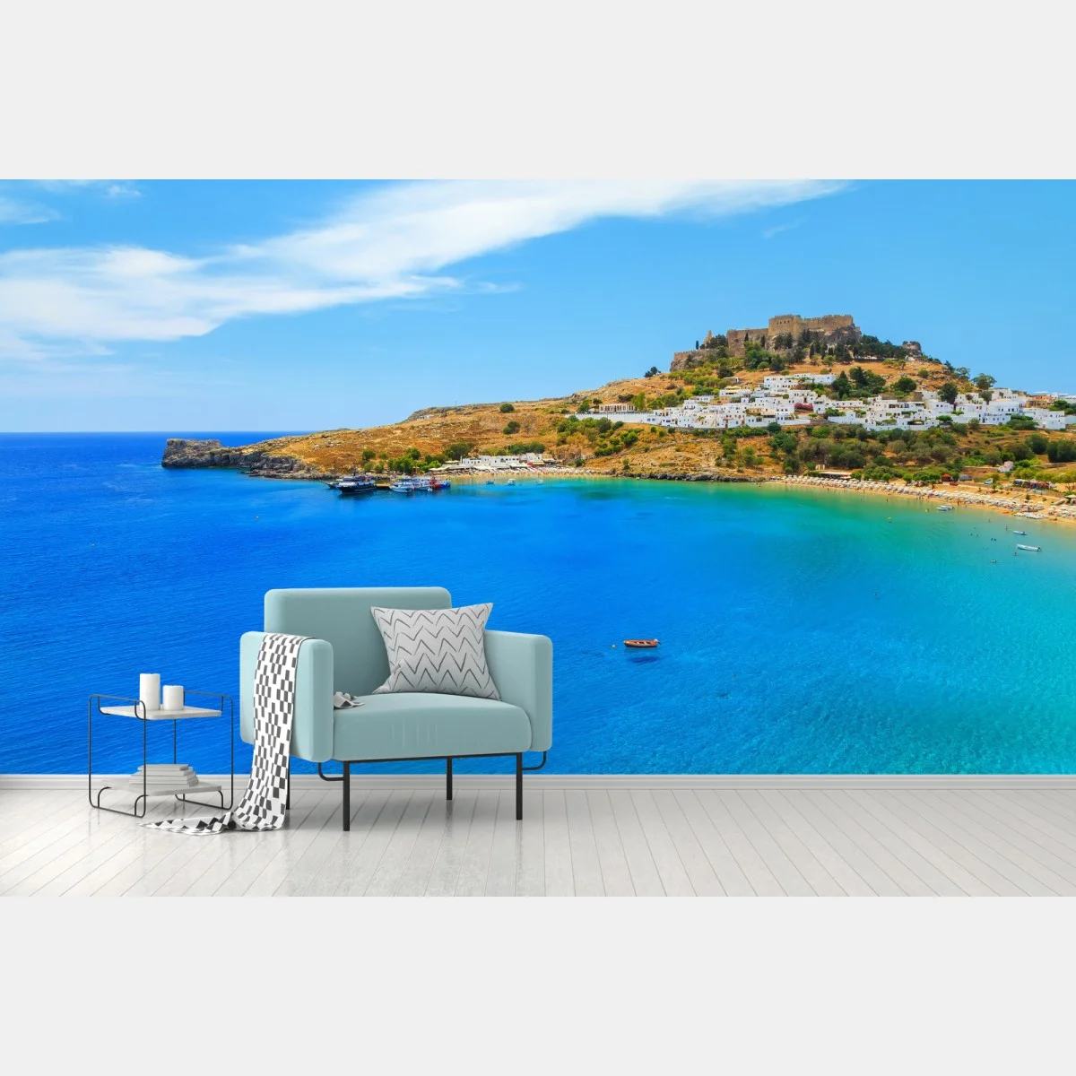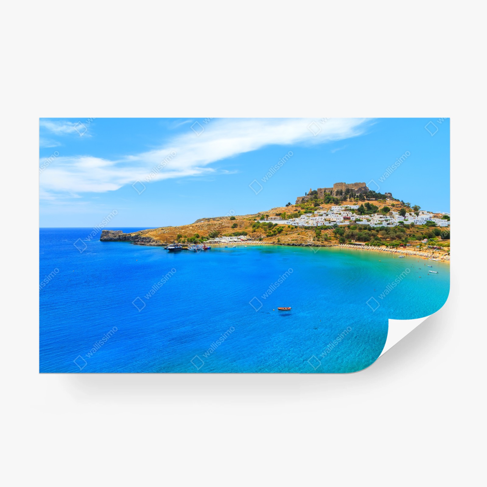 Fototapete Sonnige bucht mit hügeligem küstendorf