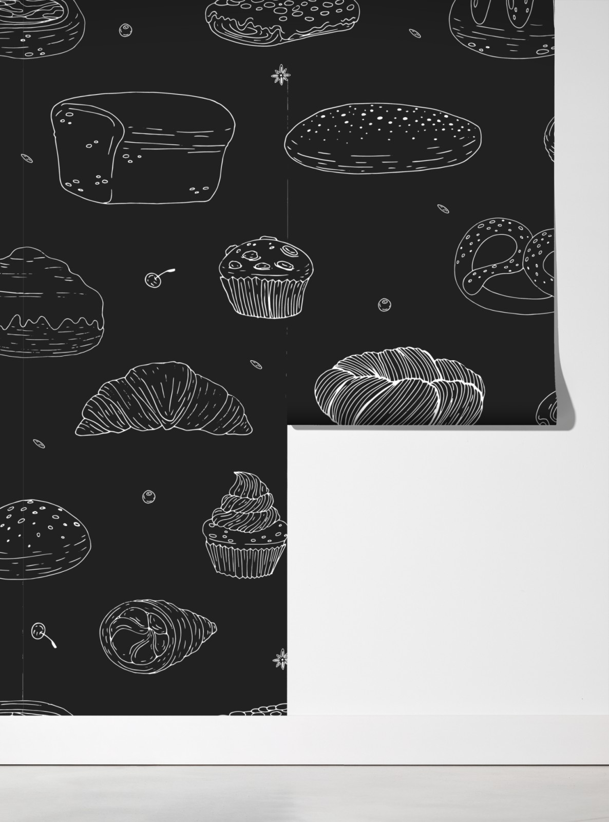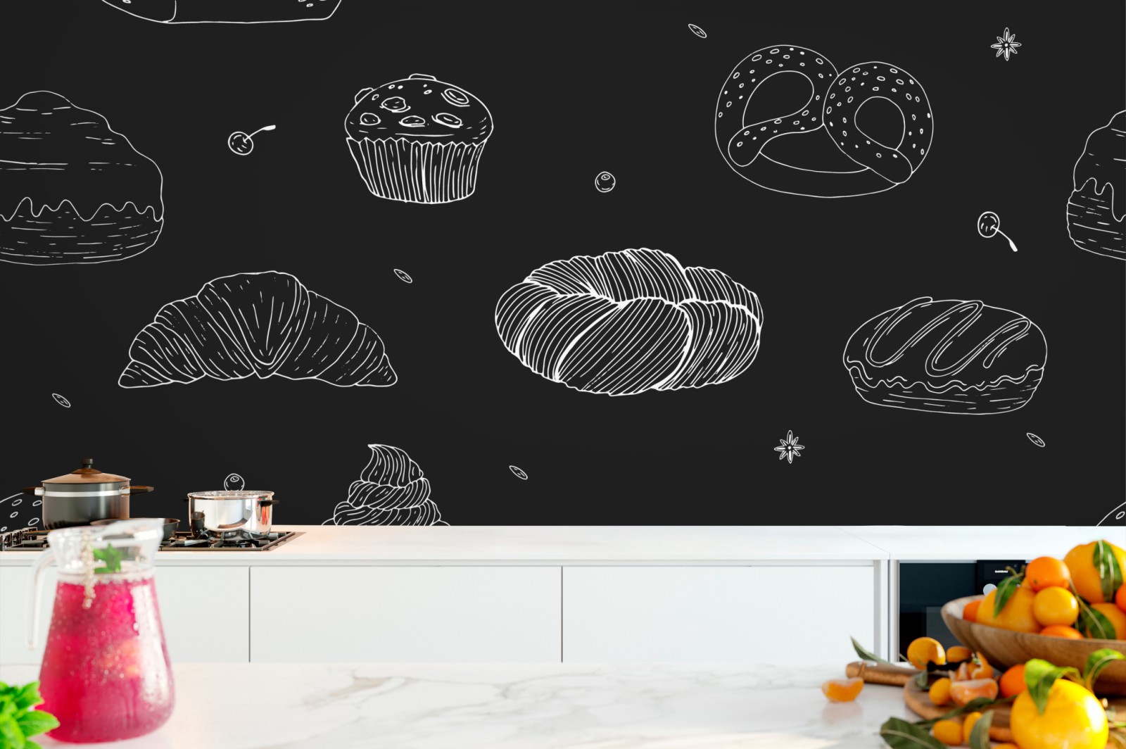 Charmantes handgezeichnetes Gebäckmuster in Weiß auf schwarzem Hintergrund verleiht Ihrer Küche oder Café ein minimalistisches, stylisches Flair.