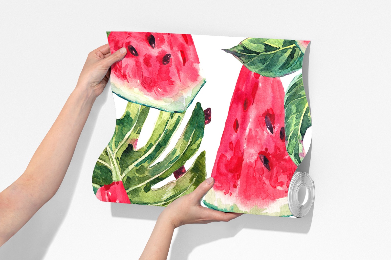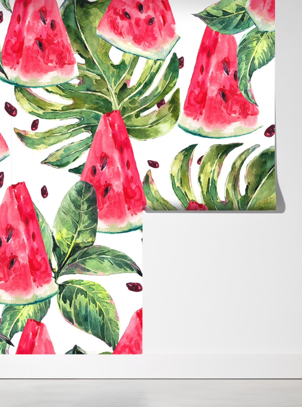 Helle Aquarell-Wassermelonen und tropische Blätter bringen eine frische, sommerliche Stimmung in jeden Raum. Perfekt für Küchen und Essbereiche, die einen verspielten, botanischen Akzent suchen.