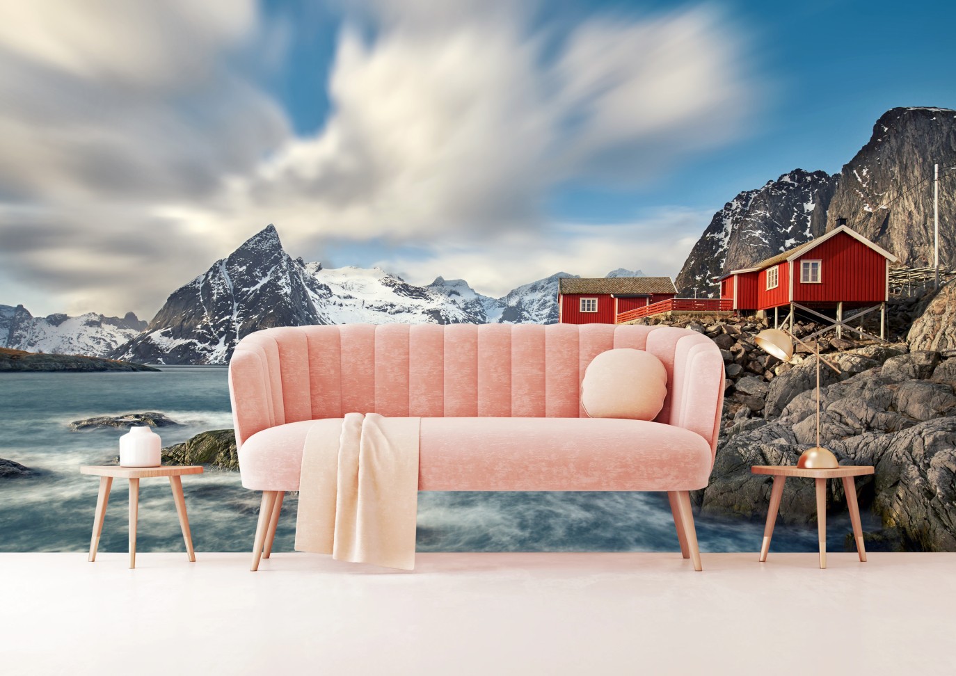 Fototapete Rote hütten an verschneiten küstenbergen