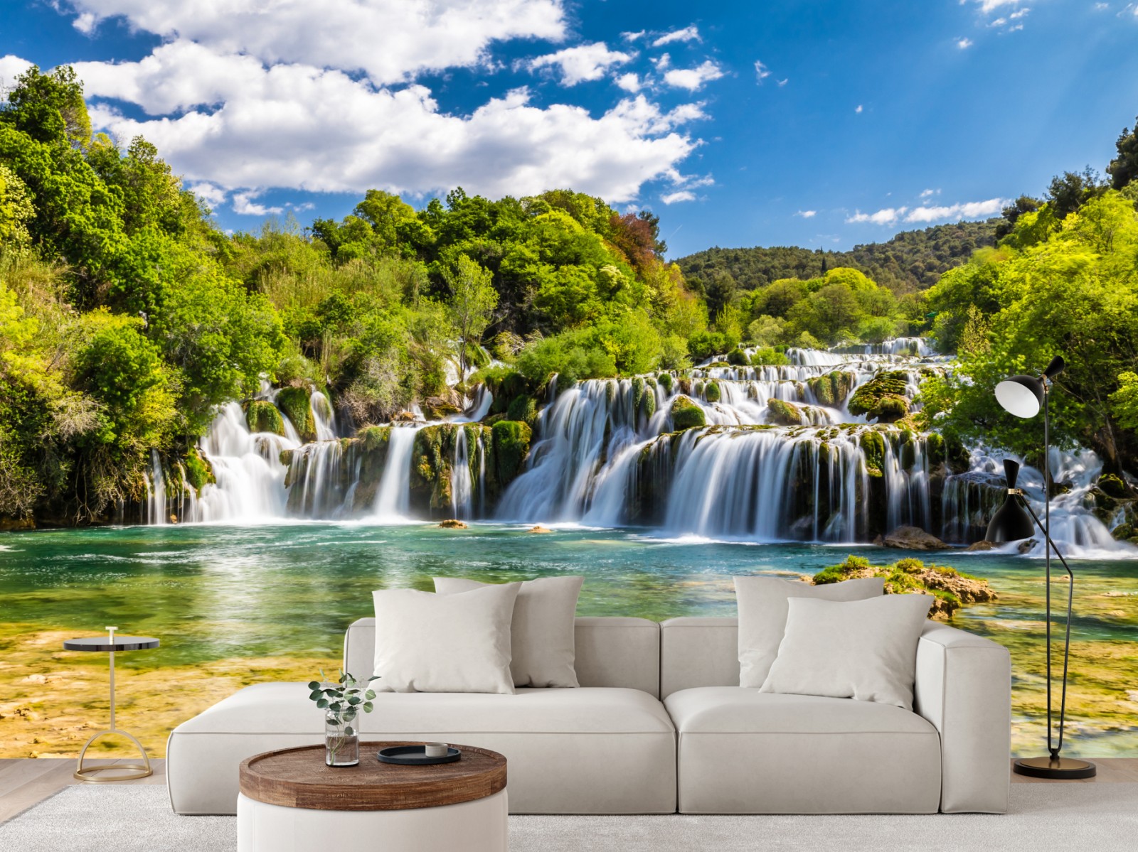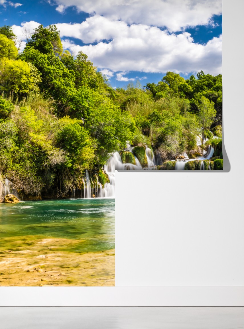 Bringen Sie die beruhigende Kraft des fallenden Wassers in Ihr Zuhause mit diesem lebendigen Foto von Skradinski Buk im Krka Nationalpark, das smaragdgrüne Wälder und türkisfarbene Becken zeigt.