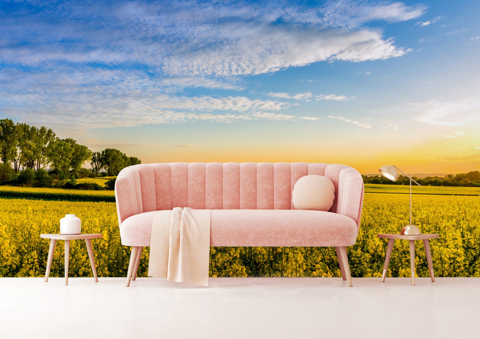 Ein leuchtendes Rapsfeld erstreckt sich bis zum Horizont unter klarem blauem Himmel und bringt warme, natürliche Atmosphäre in jeden Raum.