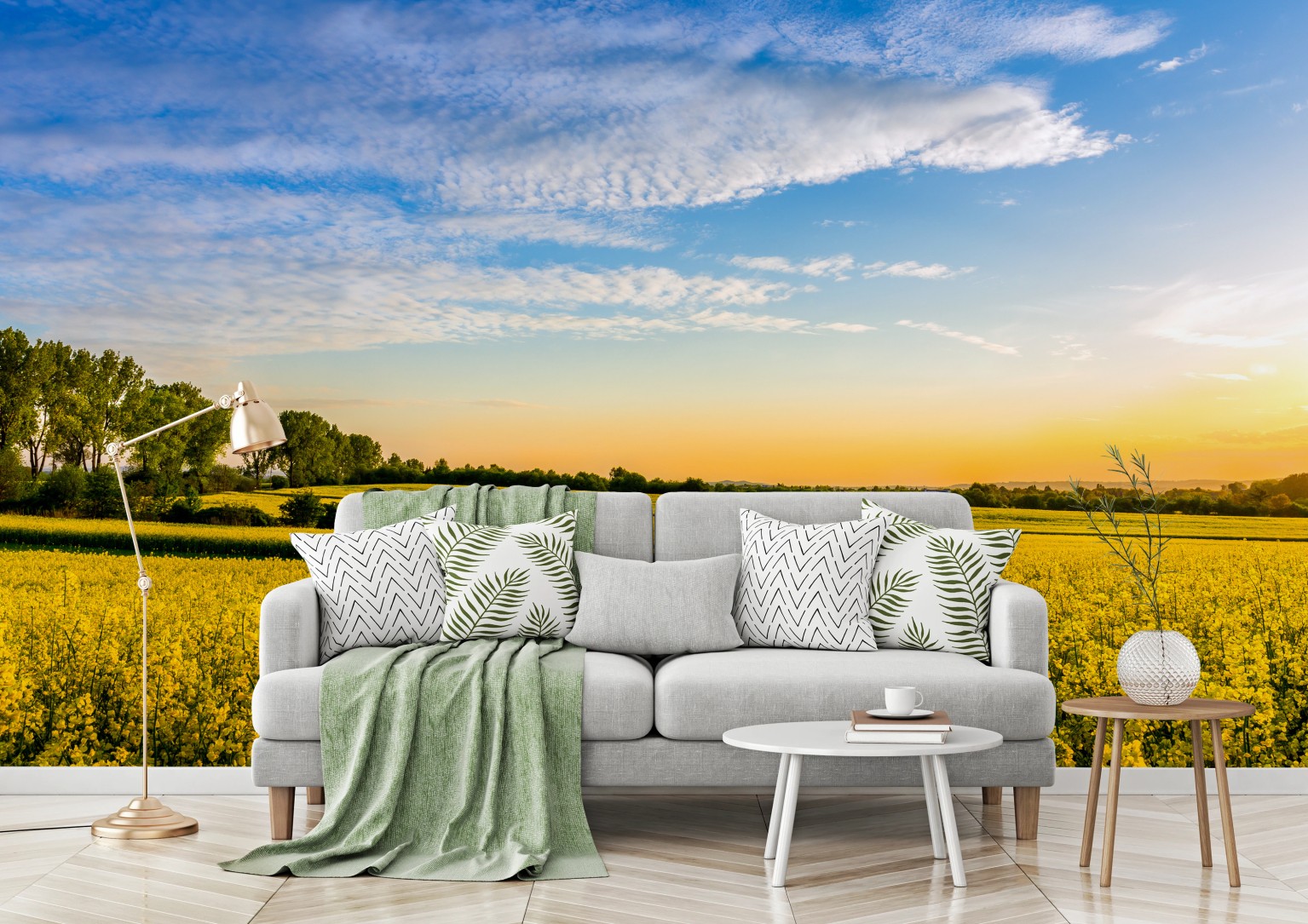 Ein leuchtendes Rapsfeld erstreckt sich bis zum Horizont unter klarem blauem Himmel und bringt warme, natürliche Atmosphäre in jeden Raum.MehrWeniger