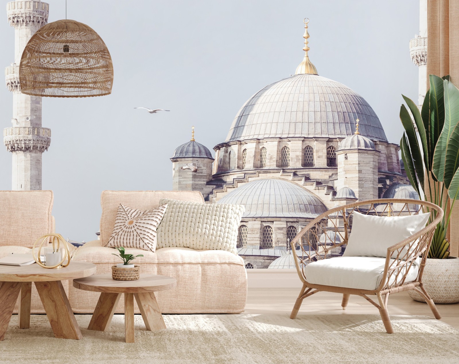 Elegantes Architekturfoto einer historischen Moschee mit geschichteten Kuppeln und Minaretten in pastelligen Tönen, ideal um eine ruhige, reiseinspirierte Atmosphäre in den Raum zu bringen.MehrWeniger