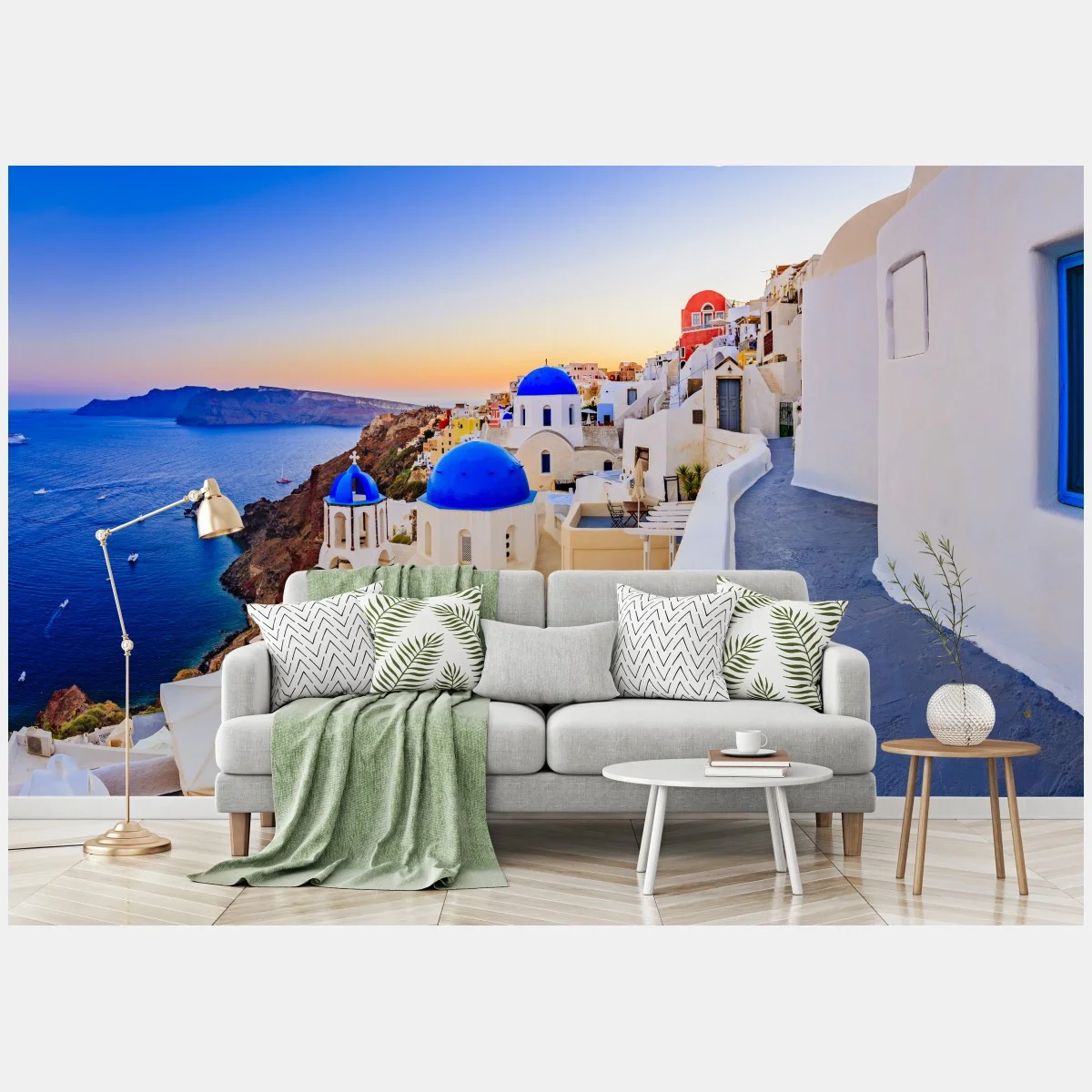 Fototapete Santorini sonnenuntergang über blauen kuppeln