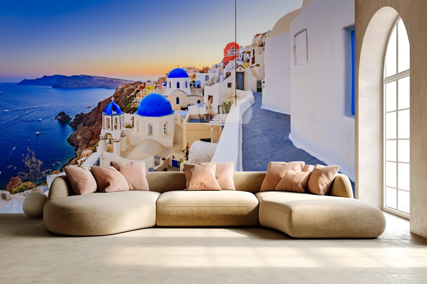 Fototapete Santorini sonnenuntergang über blauen kuppeln