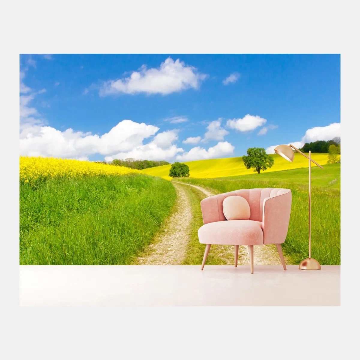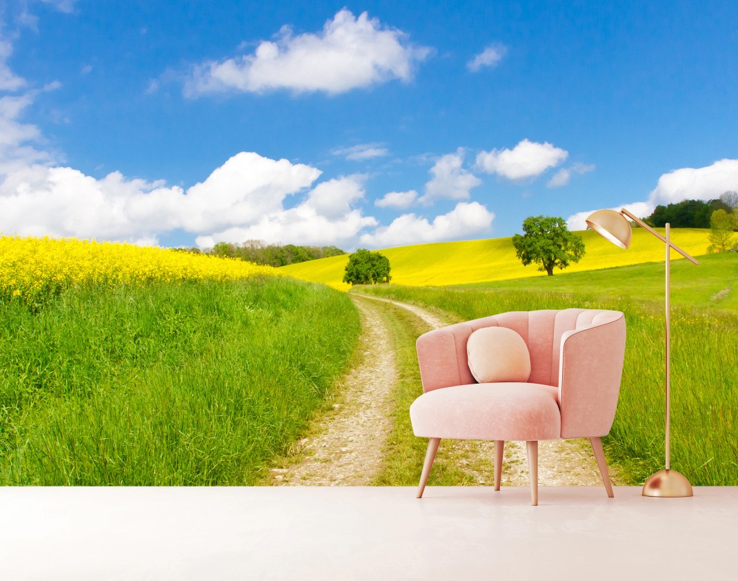 Helle ländliche Landschaft mit einem Feldweg durch grüne Wiesen und goldene Rapsfelder unter klarem blauem Himmel — perfekt, um die Natur ins Zuhause zu holen.MehrWeniger