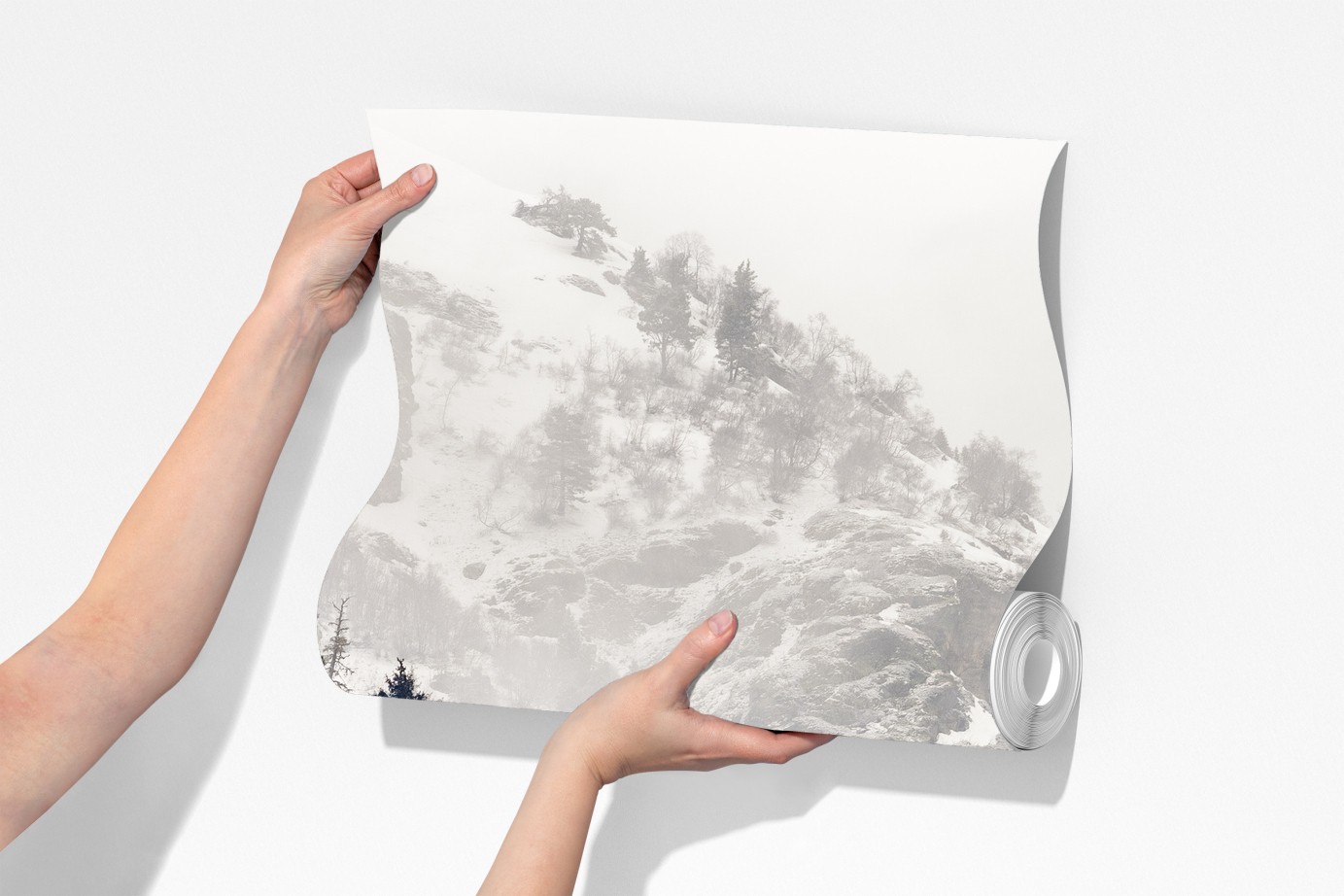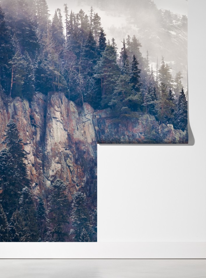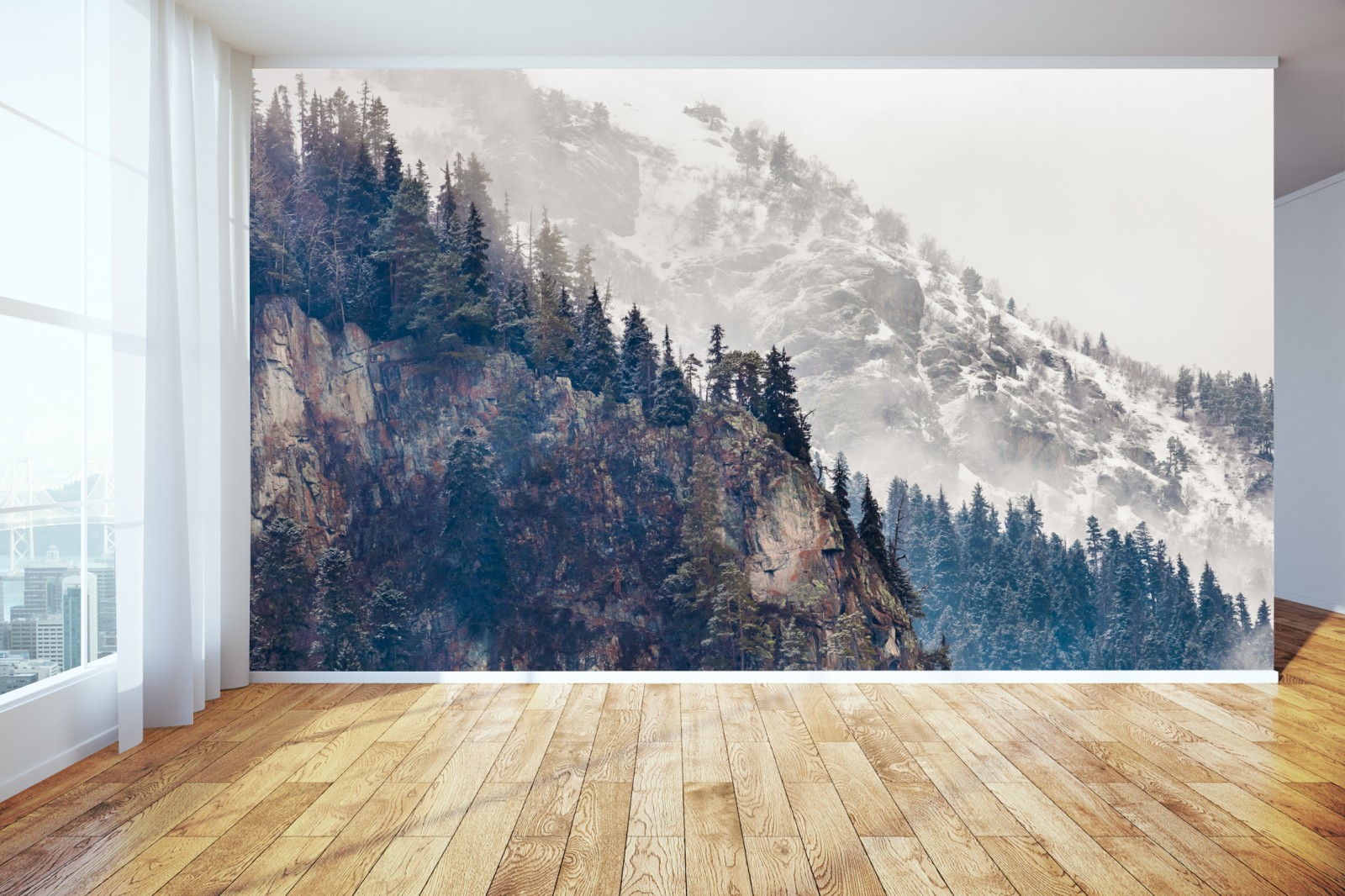 Fototapete nebliger berg mit felsklippe und kieferwald – Wallnifity®