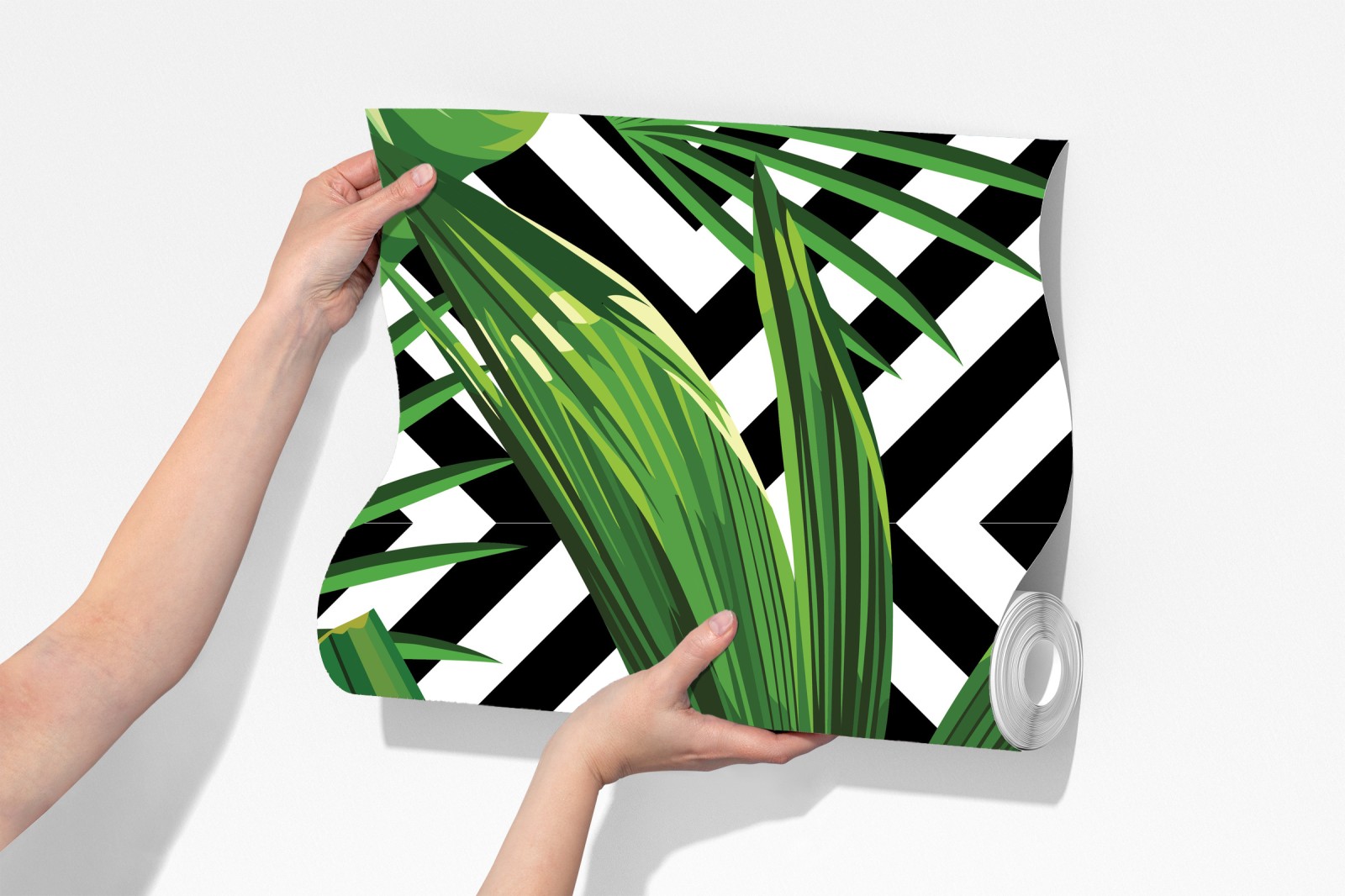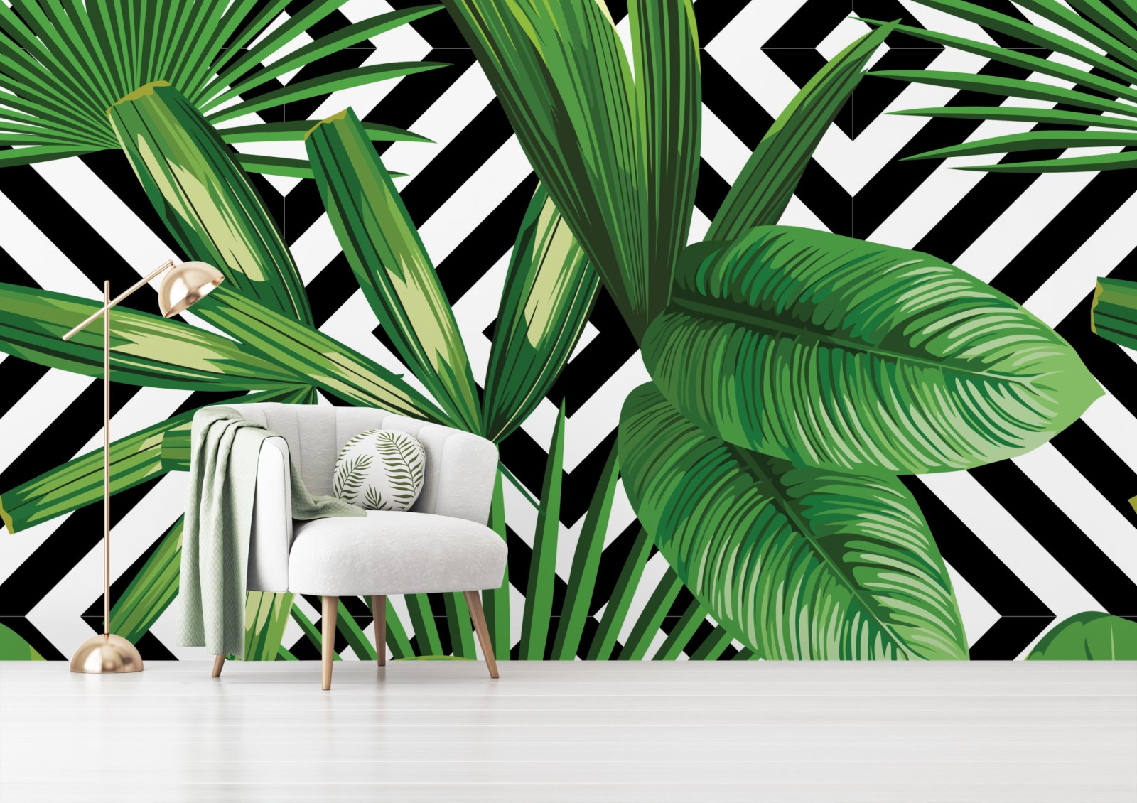 Lebhafte tropische Blätter auf kontrastierendem Schwarz-Weiß-Hintergrund bringen frische, moderne Atmosphäre in jeden Raum.