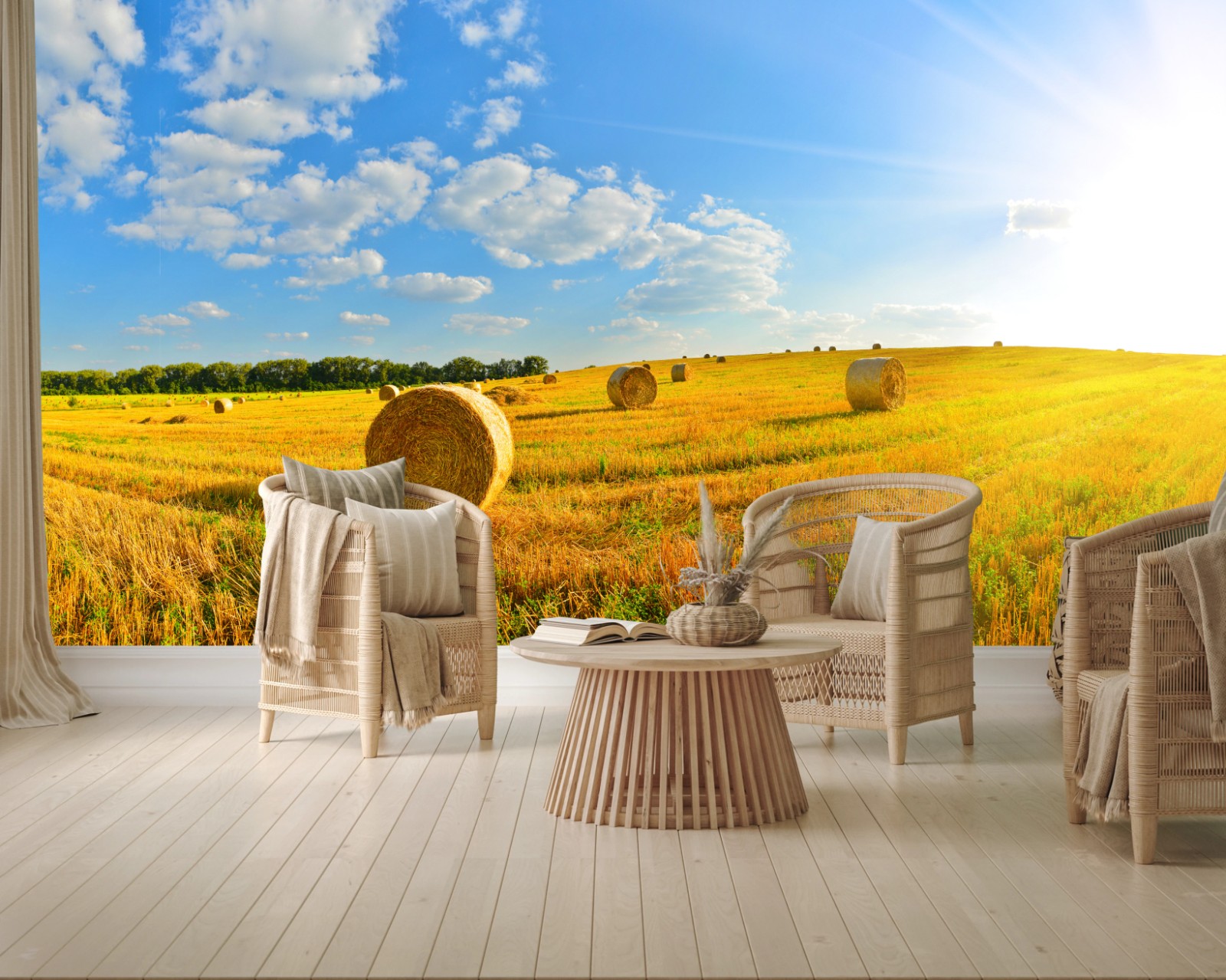 Bringen Sie ländlichen Charme in Ihr Zuhause mit einer sonnenverwöhnten Panoramaaufnahme von Heuballen auf einem goldenen Feld.MehrWeniger