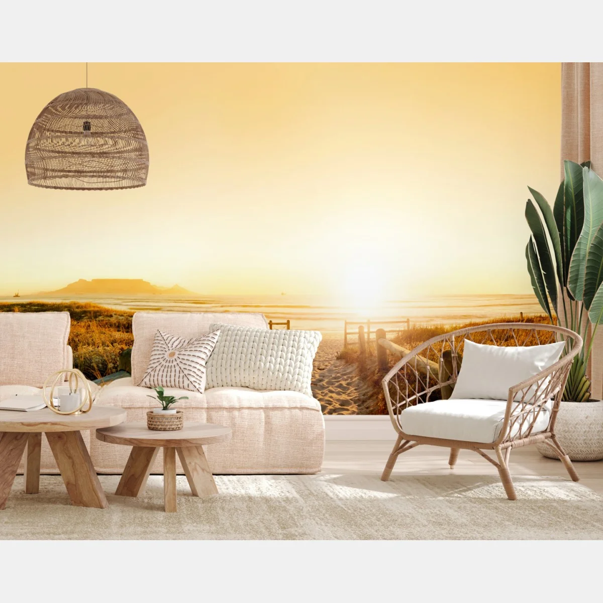 Fototapete Goldenes sonnenuntergangspanorama am strand mit Tafelberg