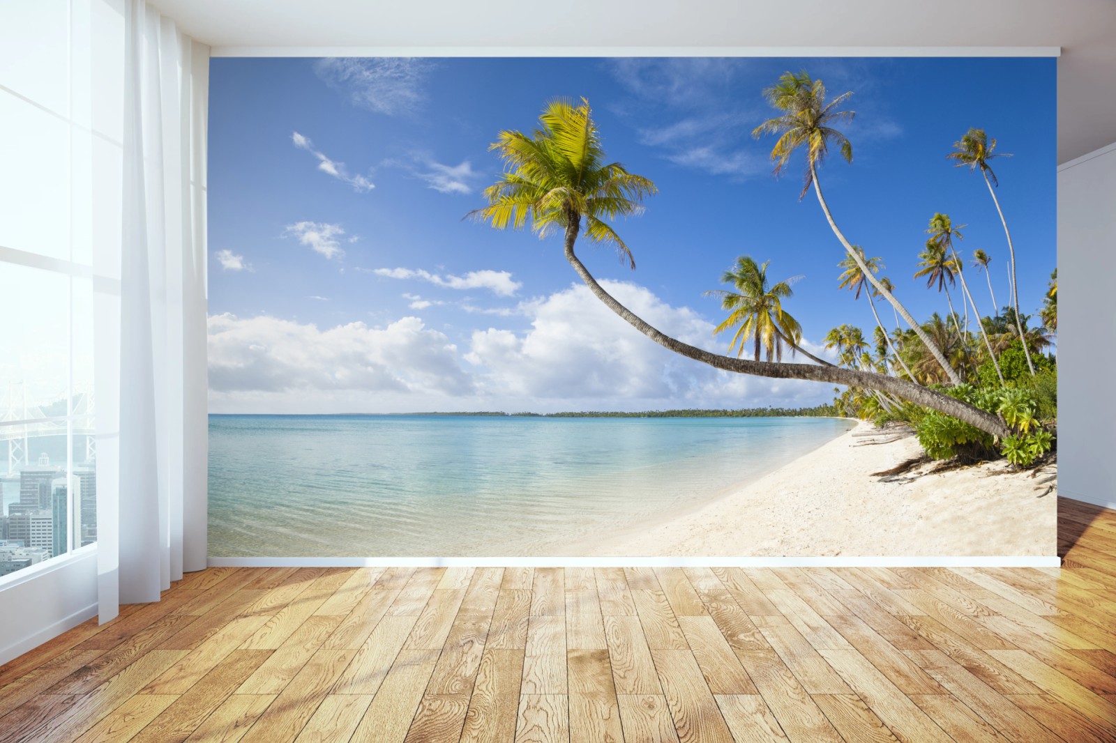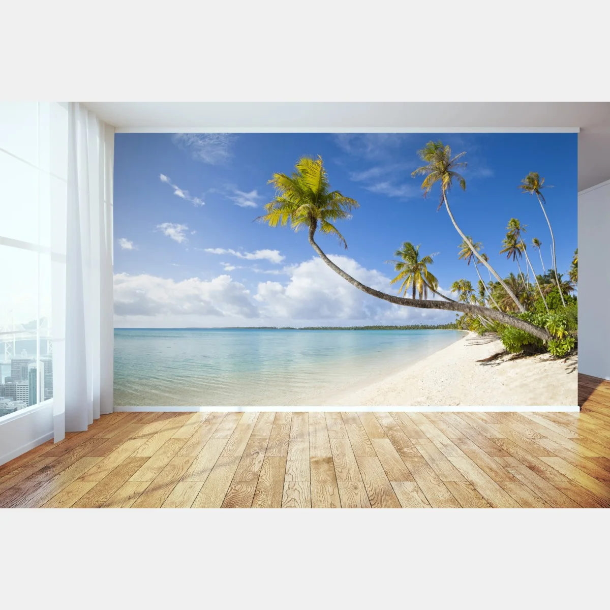 Entdecken Sie einen tropischen Strand mit türkisblauem Wasser und wiegenden Palmen, perfekt um eine ruhige Küstenatmosphäre in Ihr Zuhause zu bringen.MehrWeniger