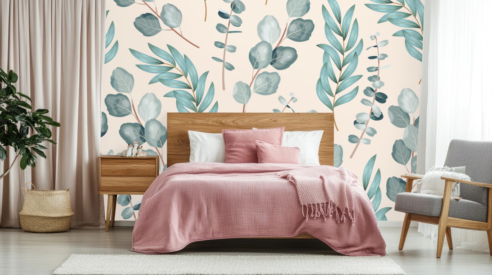 Sanfte pastellfarbene Eukalyptusblätter schaffen ein beruhigendes botanisches Muster, das jedem Raum natürliche Eleganz verleiht.MehrWeniger