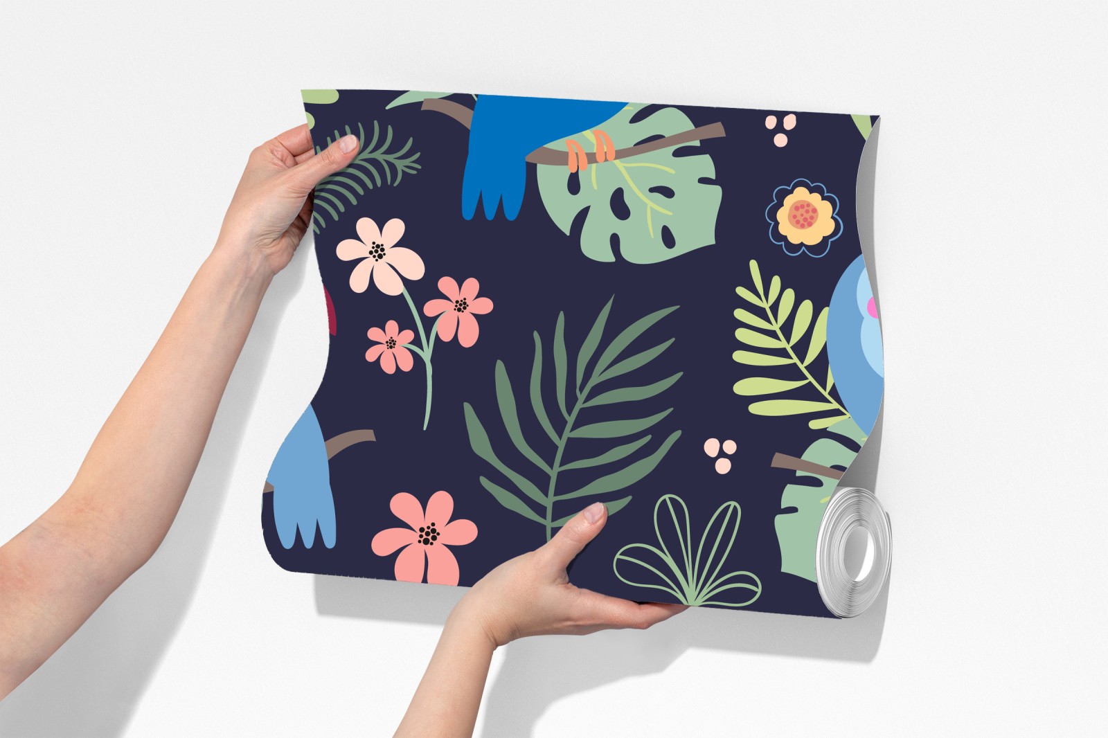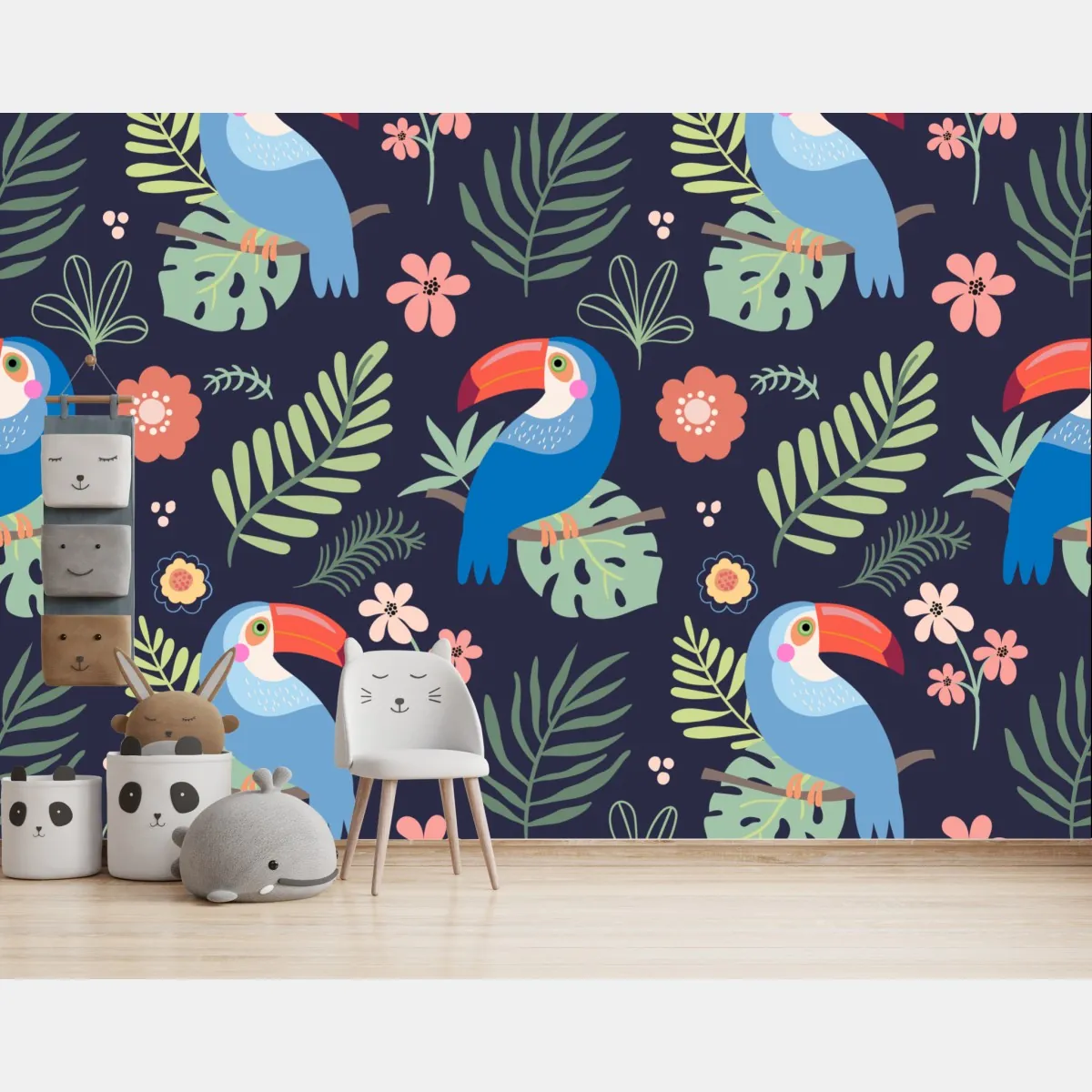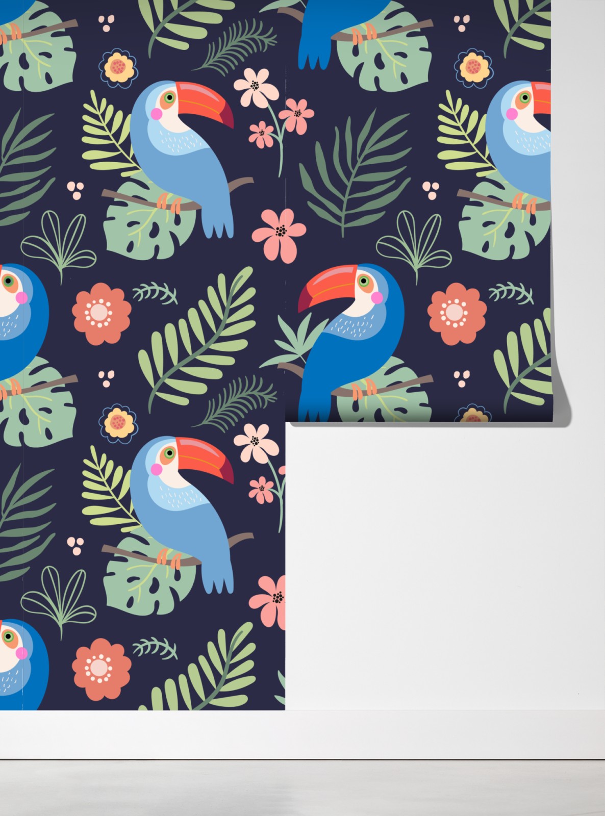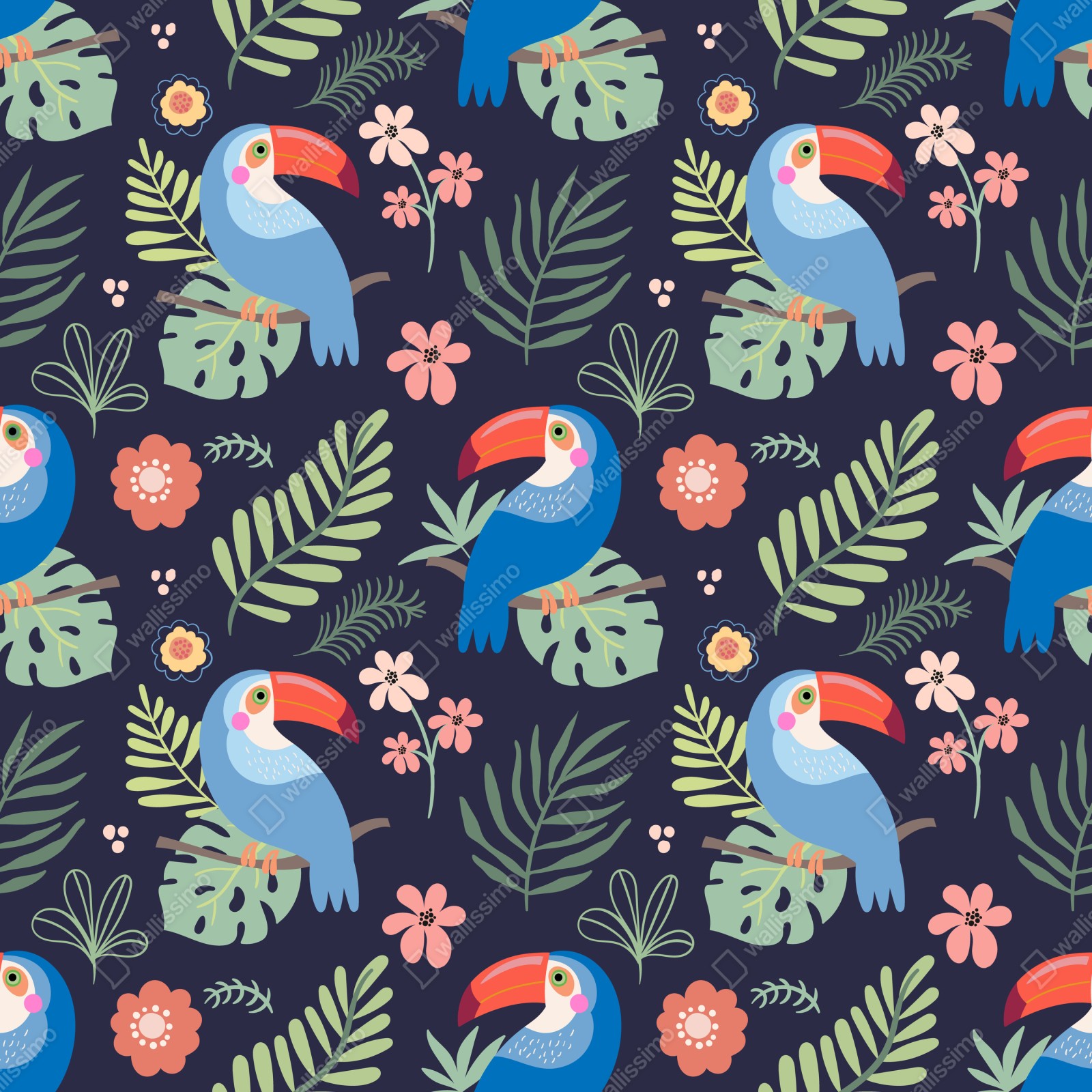 Lebhaftes tropisches Tukanmuster mit üppigen Blättern und Blumen auf tiefdunklem Blau, perfekt, um jedem Raum eine fröhliche, exotische Note zu verleihen.