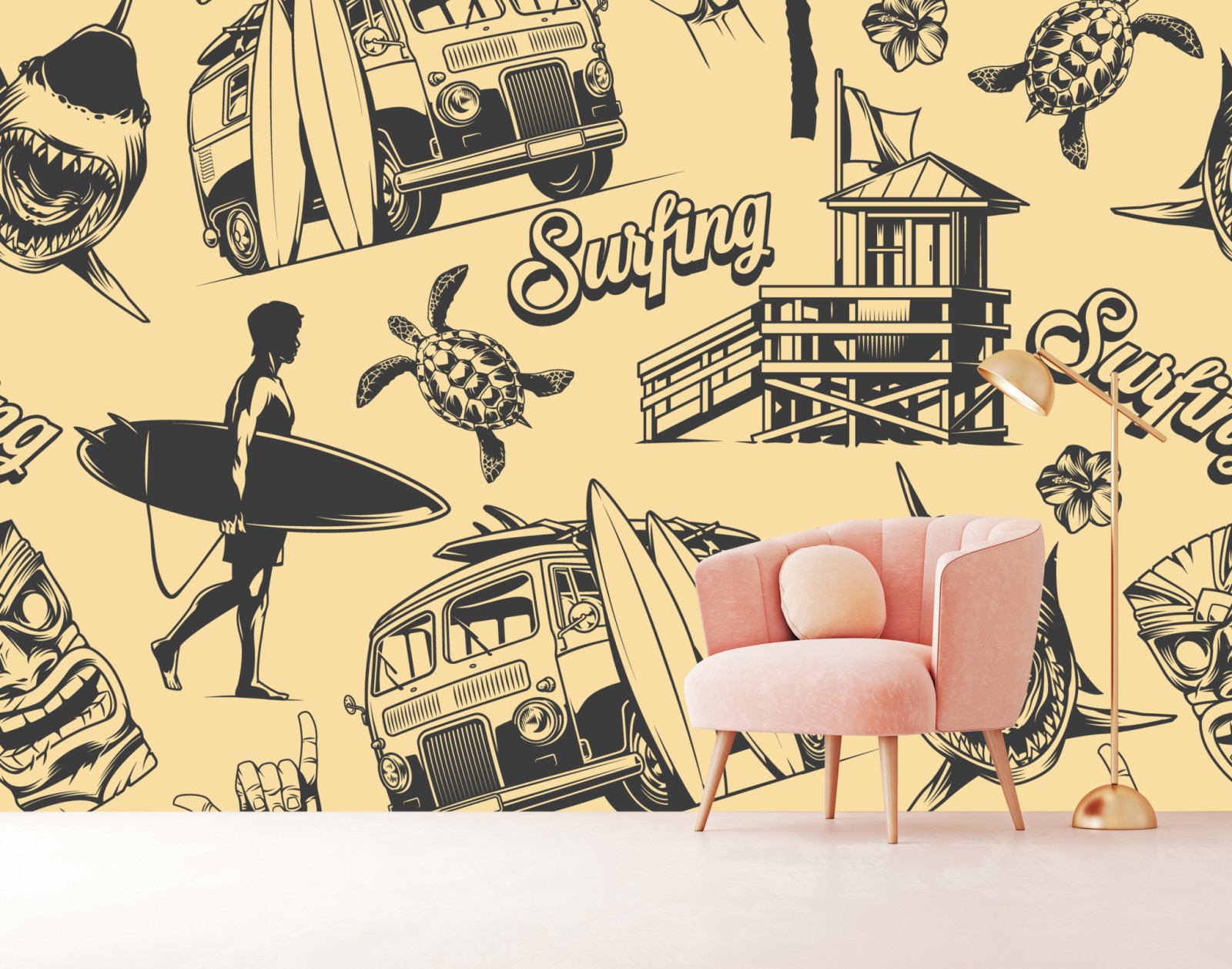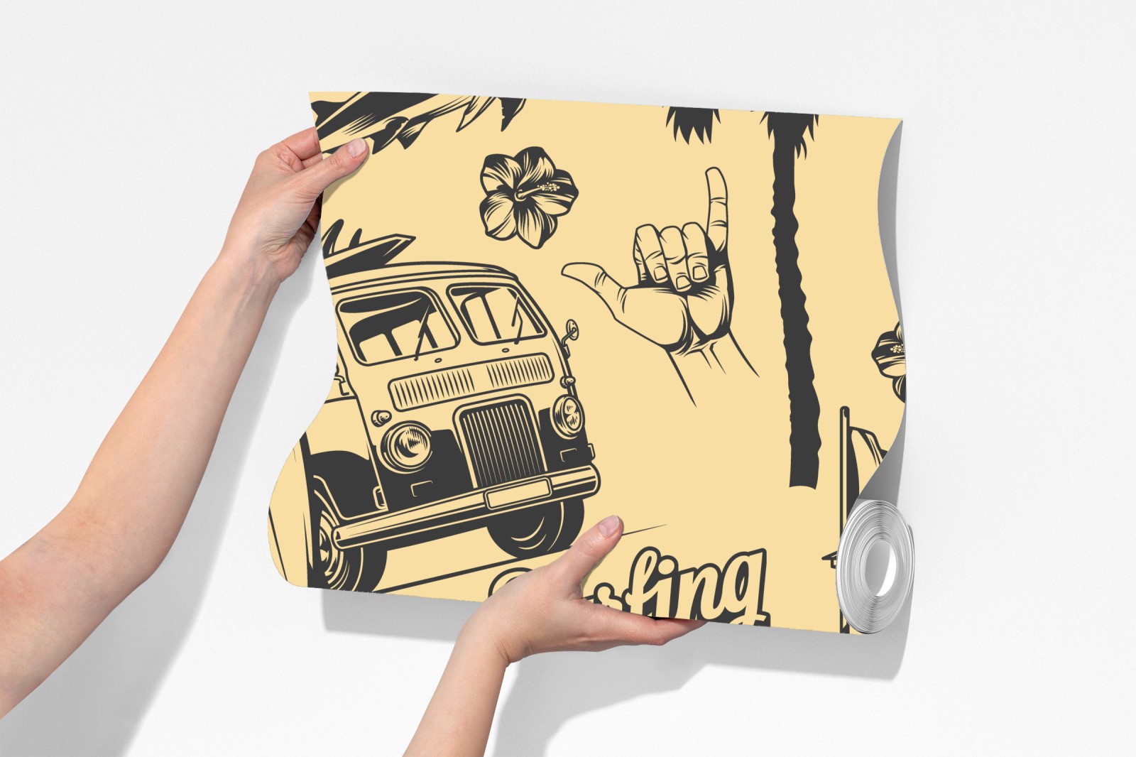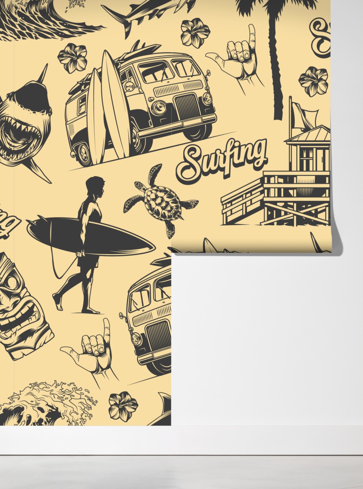 Verleihen Sie Ihrem Raum einen vintage-strandlook mit diesem retro-surfmuster voller Busse, Surfboards, Haie und Palmen.