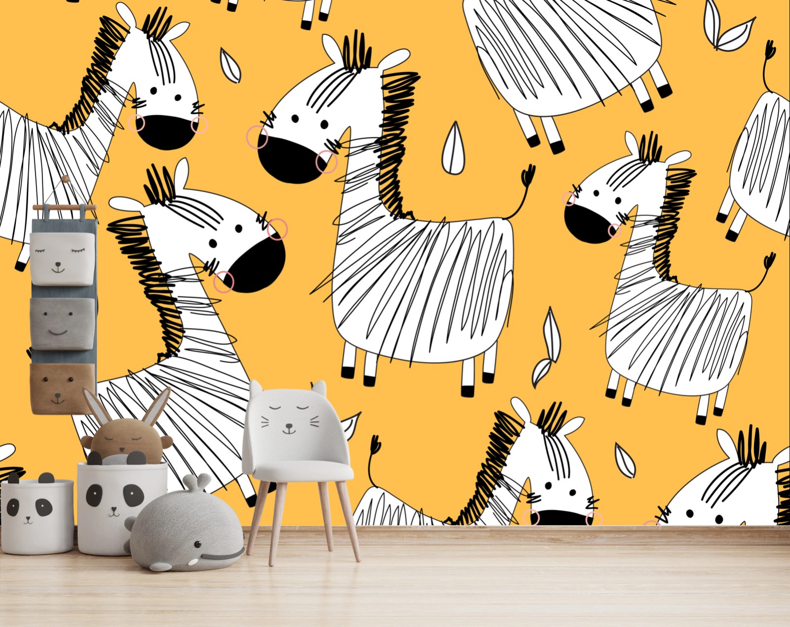 Fröhliches, sich wiederholendes Zebramuster auf warmem orangegelbem Hintergrund, das Kinderzimmer aufhellt und spielerischen Charme verleiht.MehrWeniger