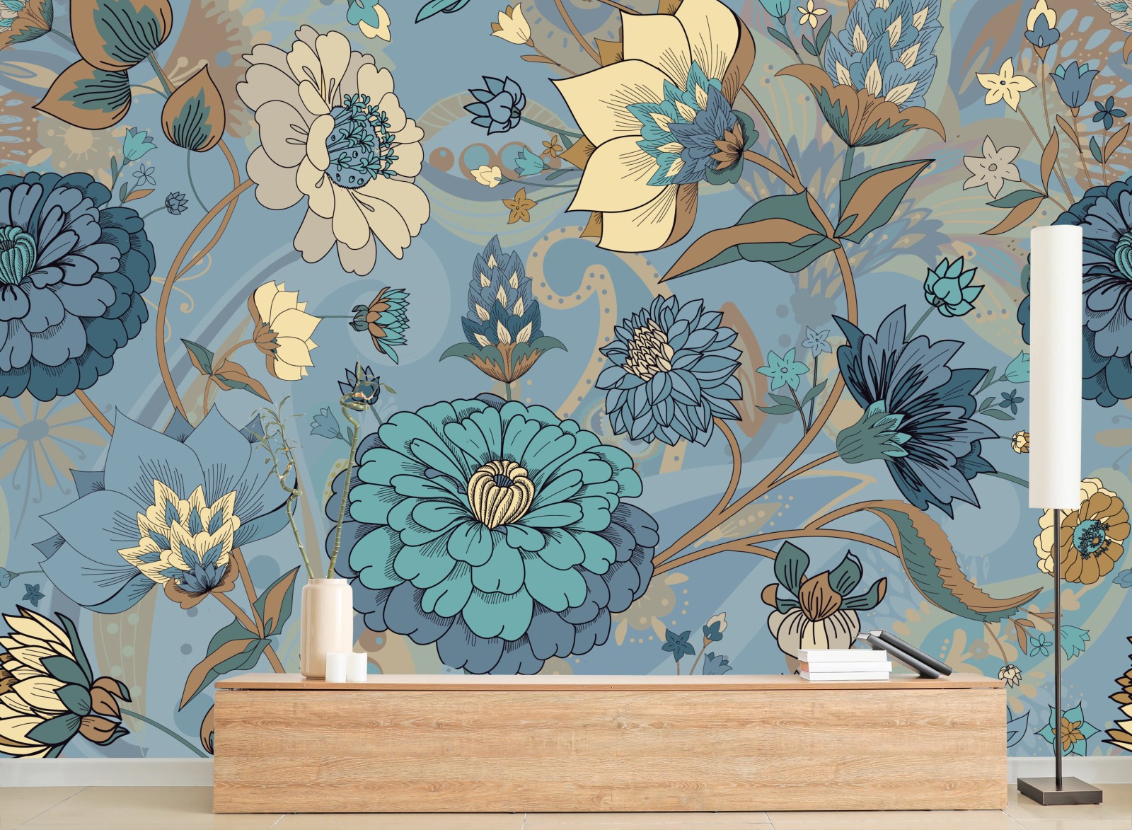 Fototapete Vintage-blumenmuster in gedämpften blau- und beigetönen