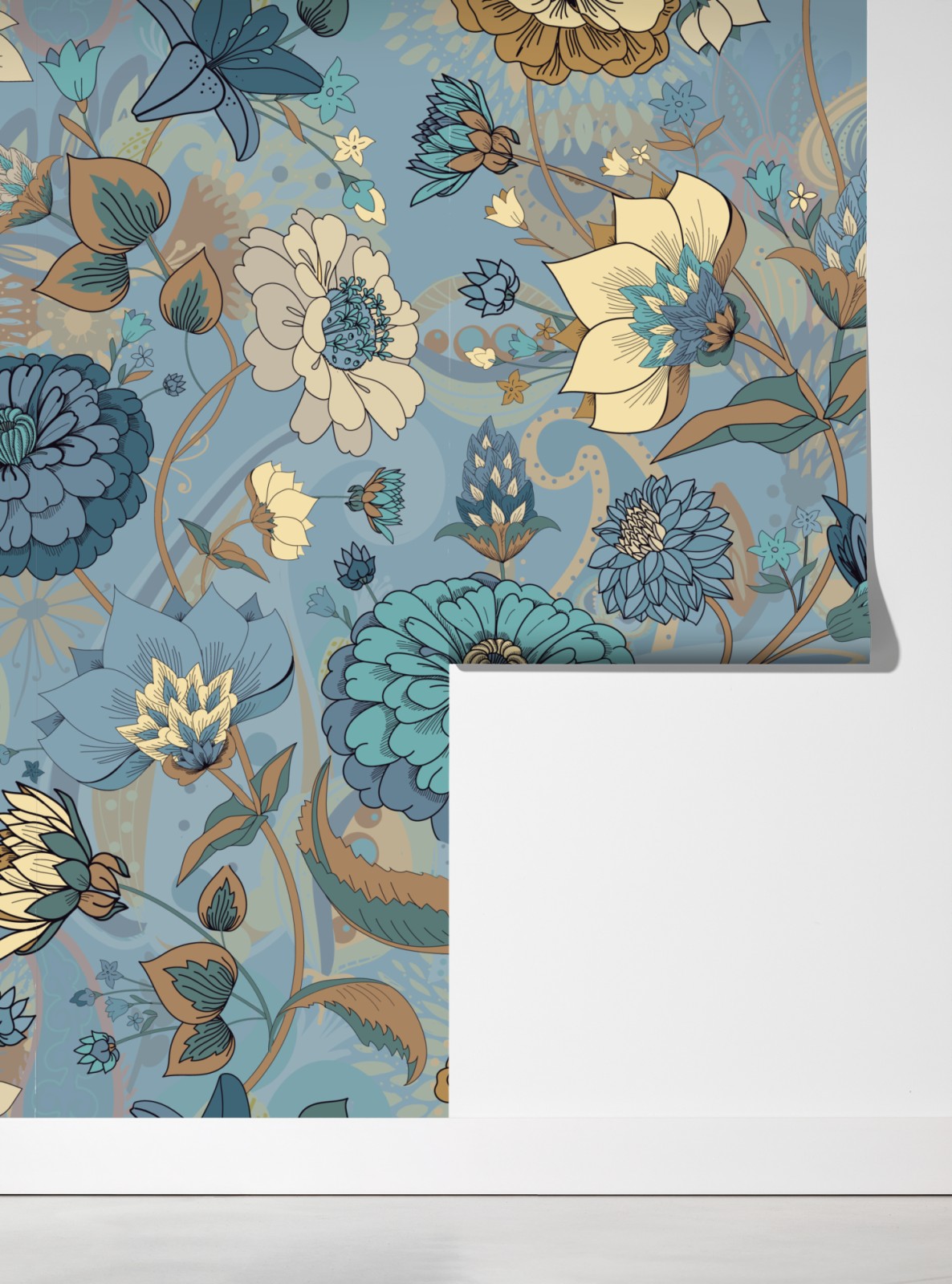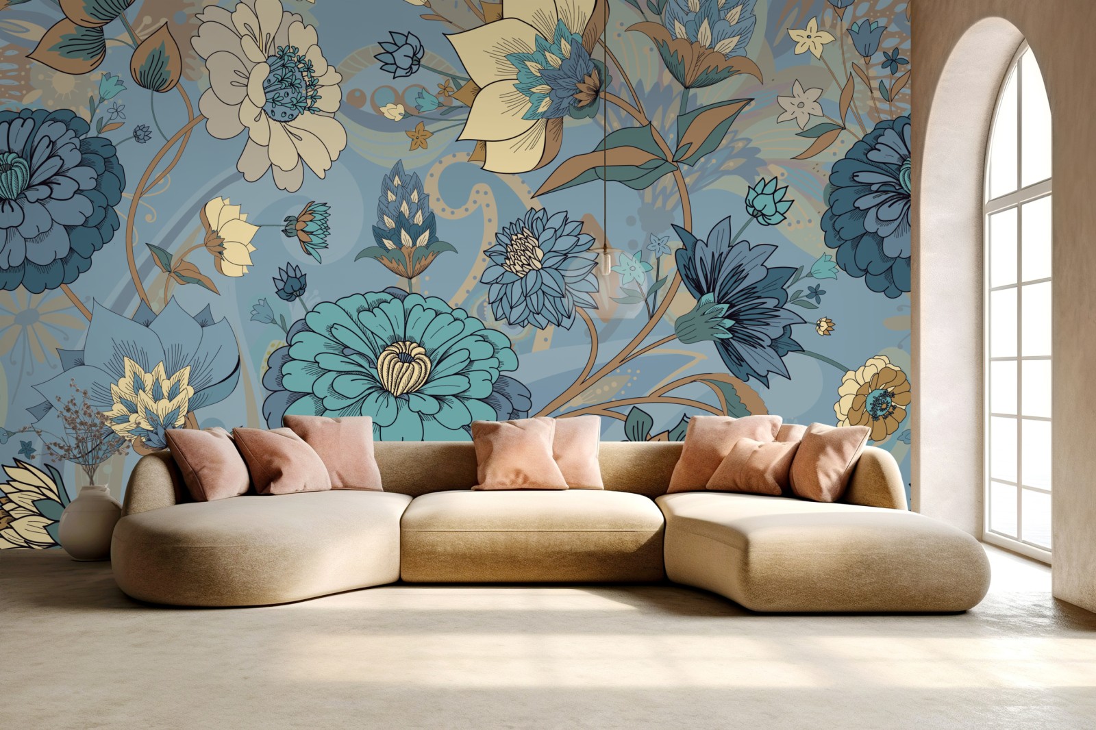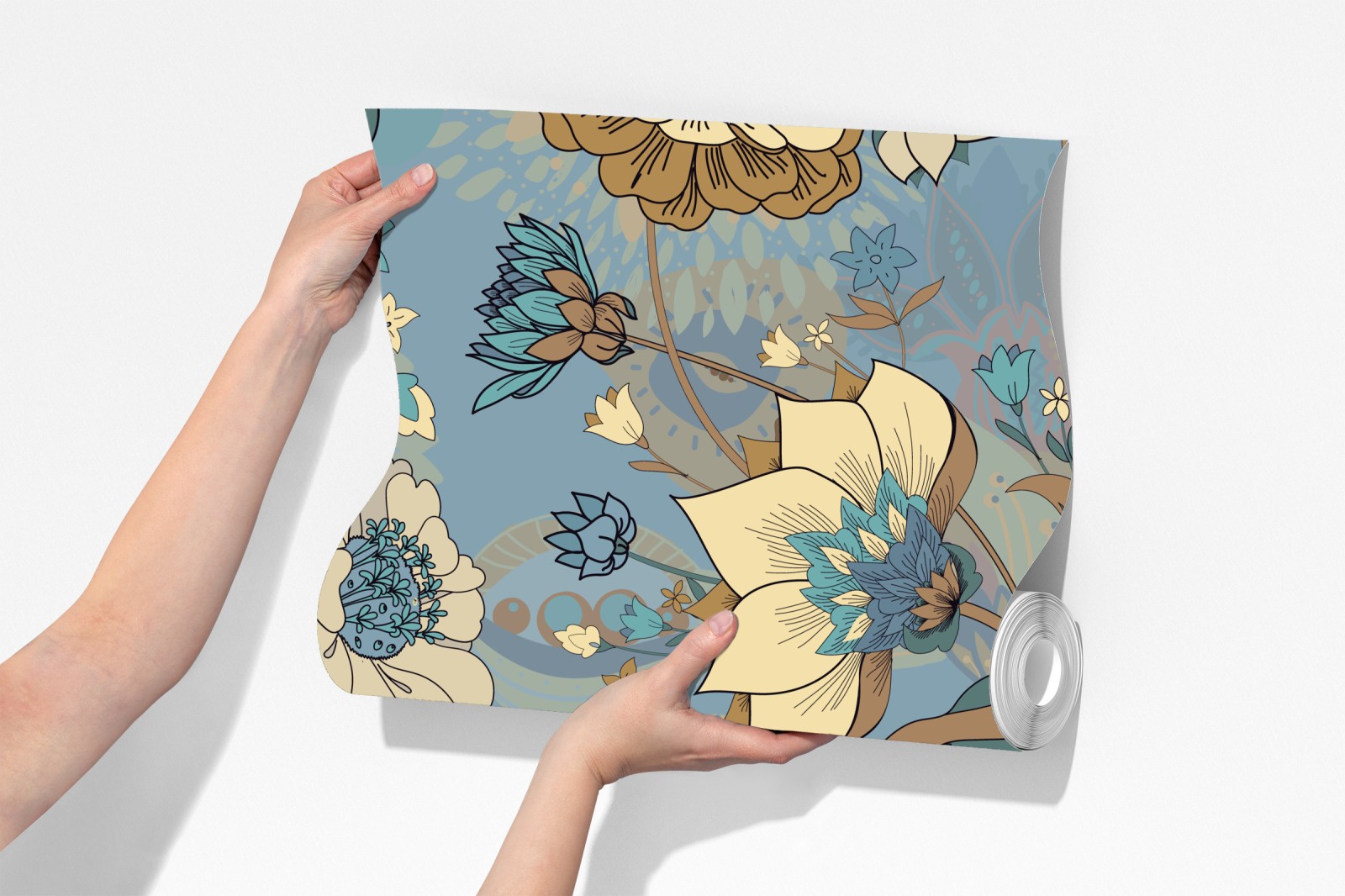 Fototapete vintage-blumenmuster in gedämpften blau- und beigetönen