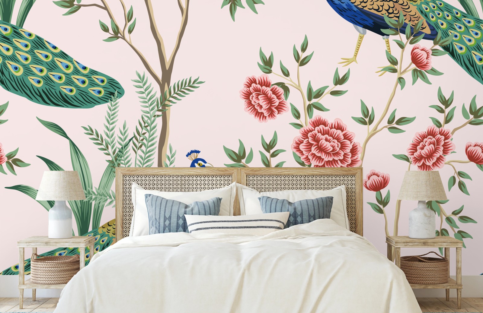 Fototapete Elegantes pfau- und blumenmuster auf rosa hintergrund