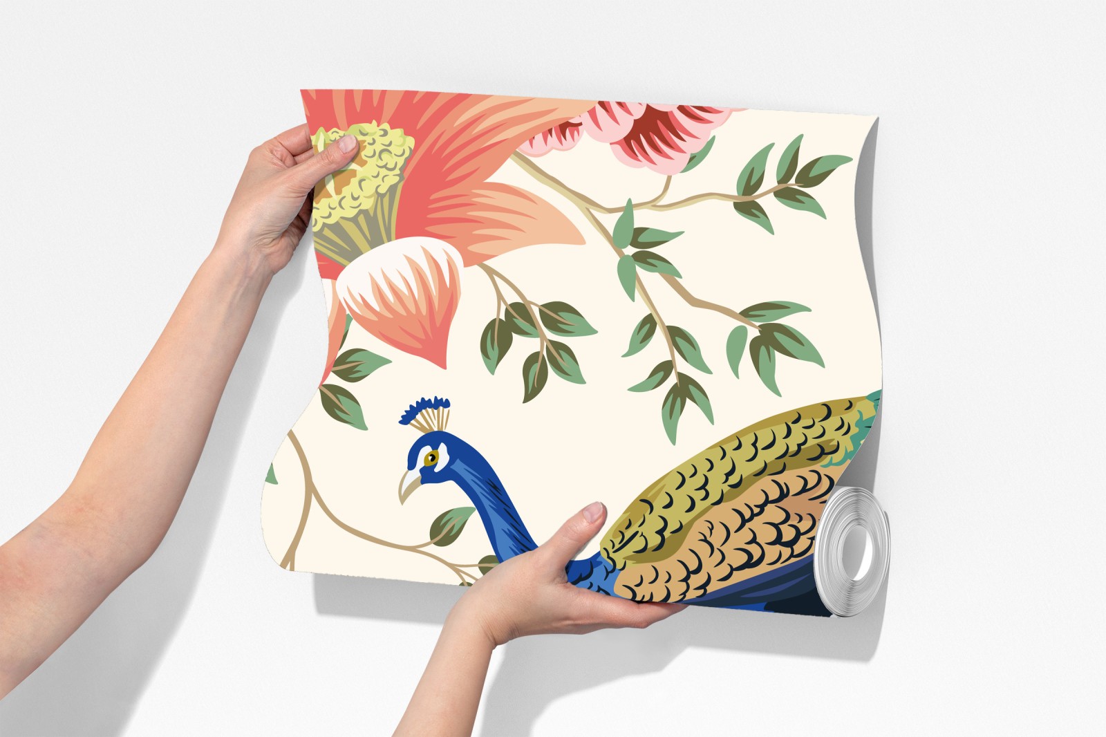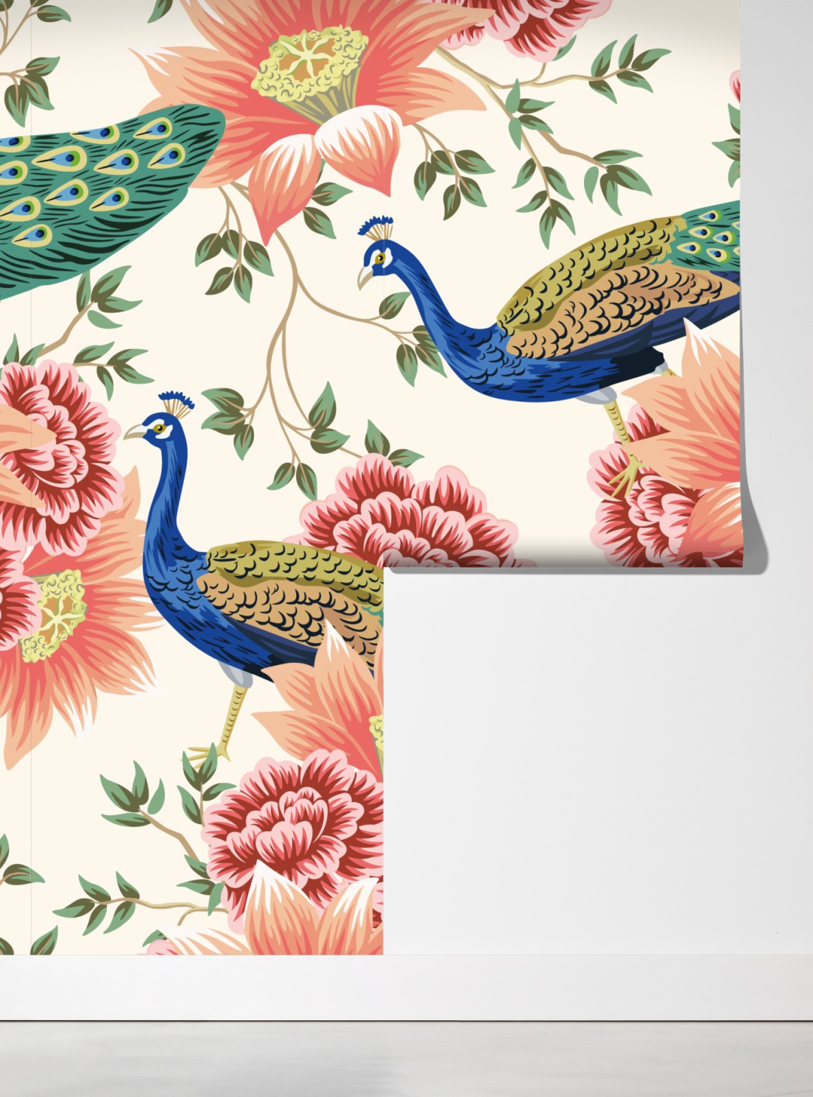 Pastellfarbene Pfauen und üppige Blüten schaffen ein elegantes, naturinspiriertes Muster, das jedem Raum raffinierte Wärme verleiht.
