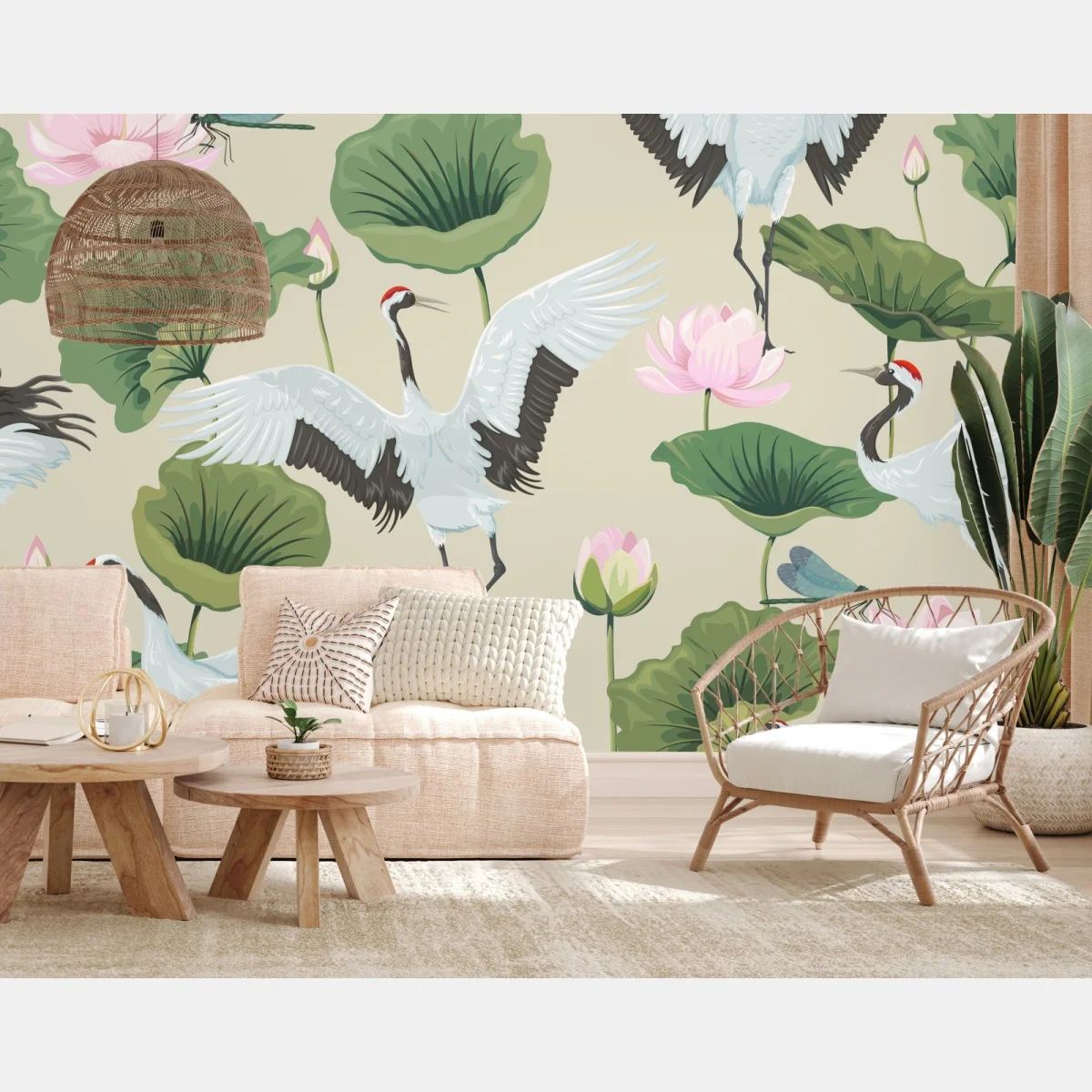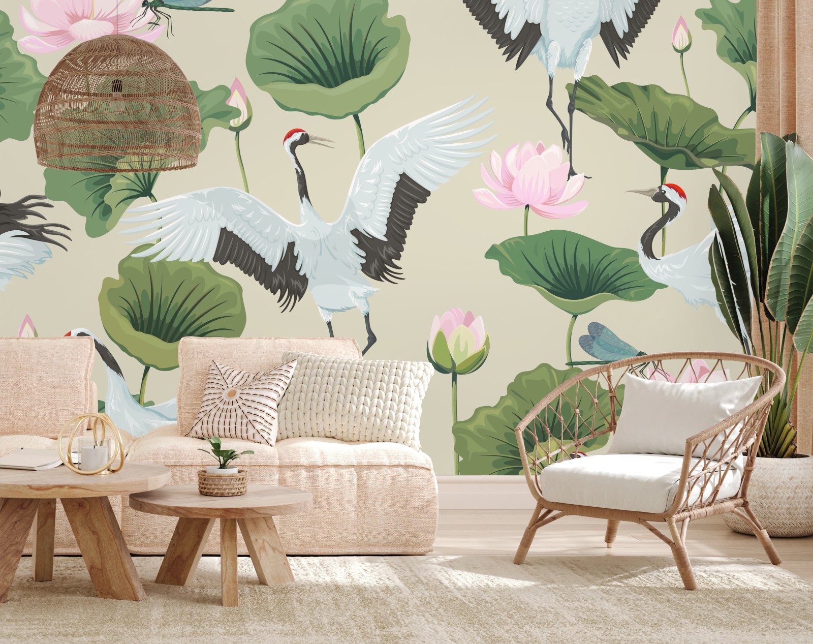 Fototapete Elegantes muster mit kranichen und lotusblumen