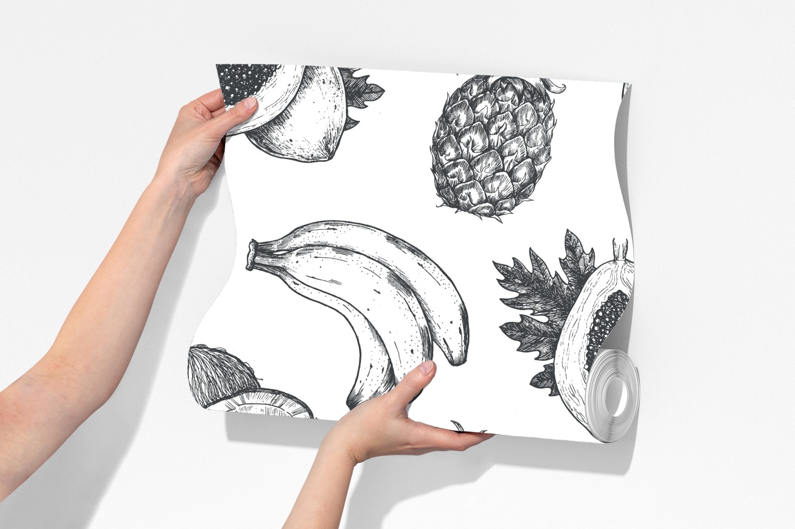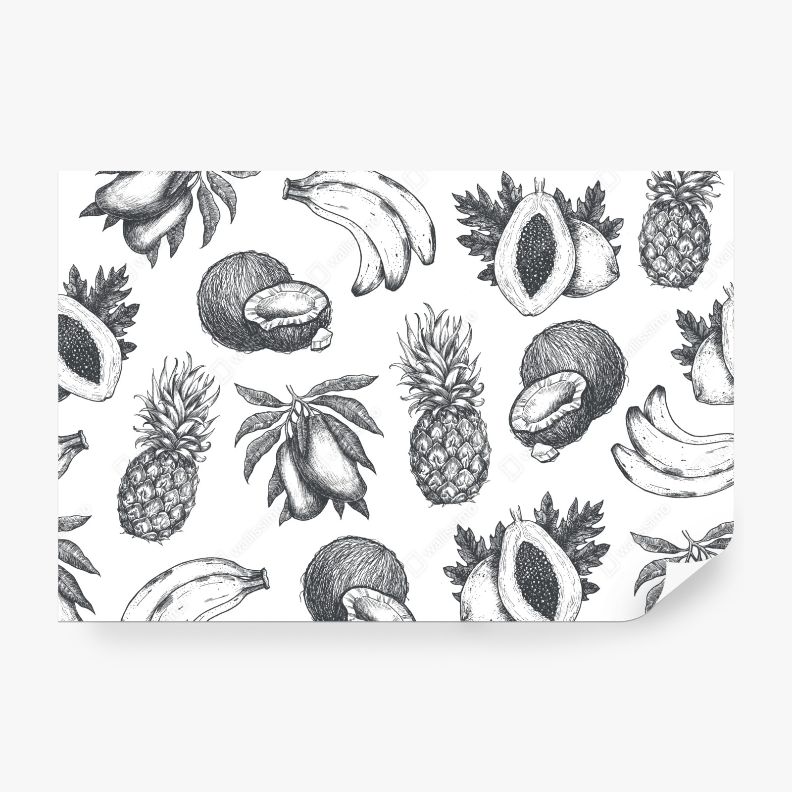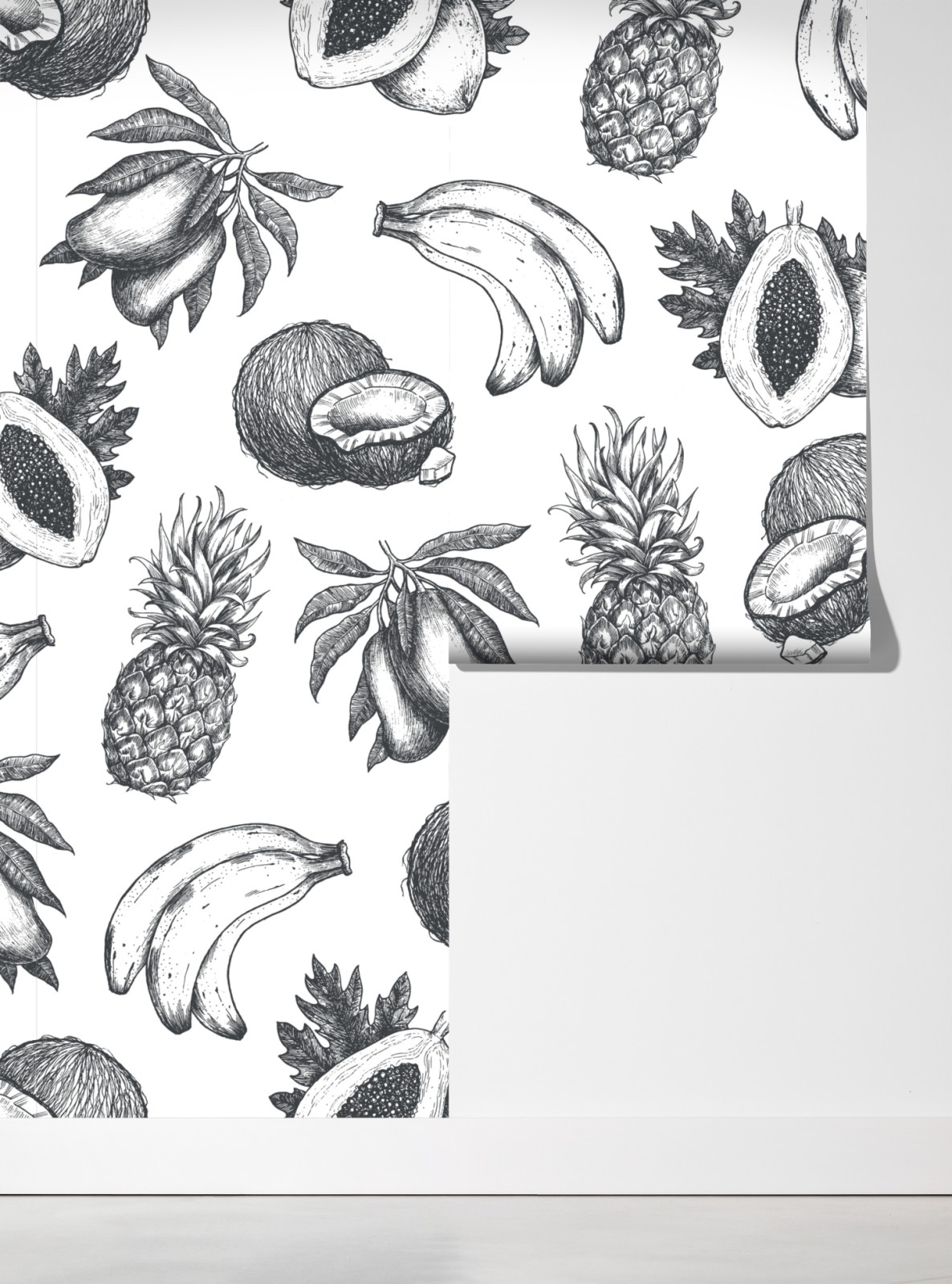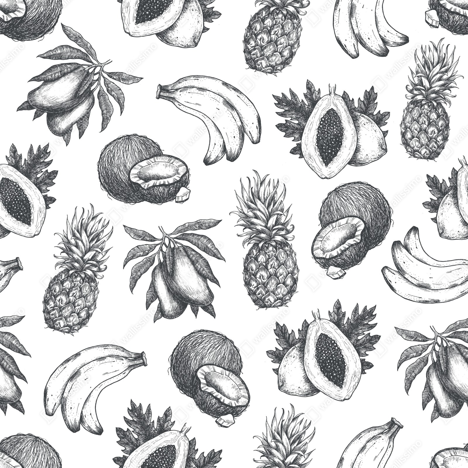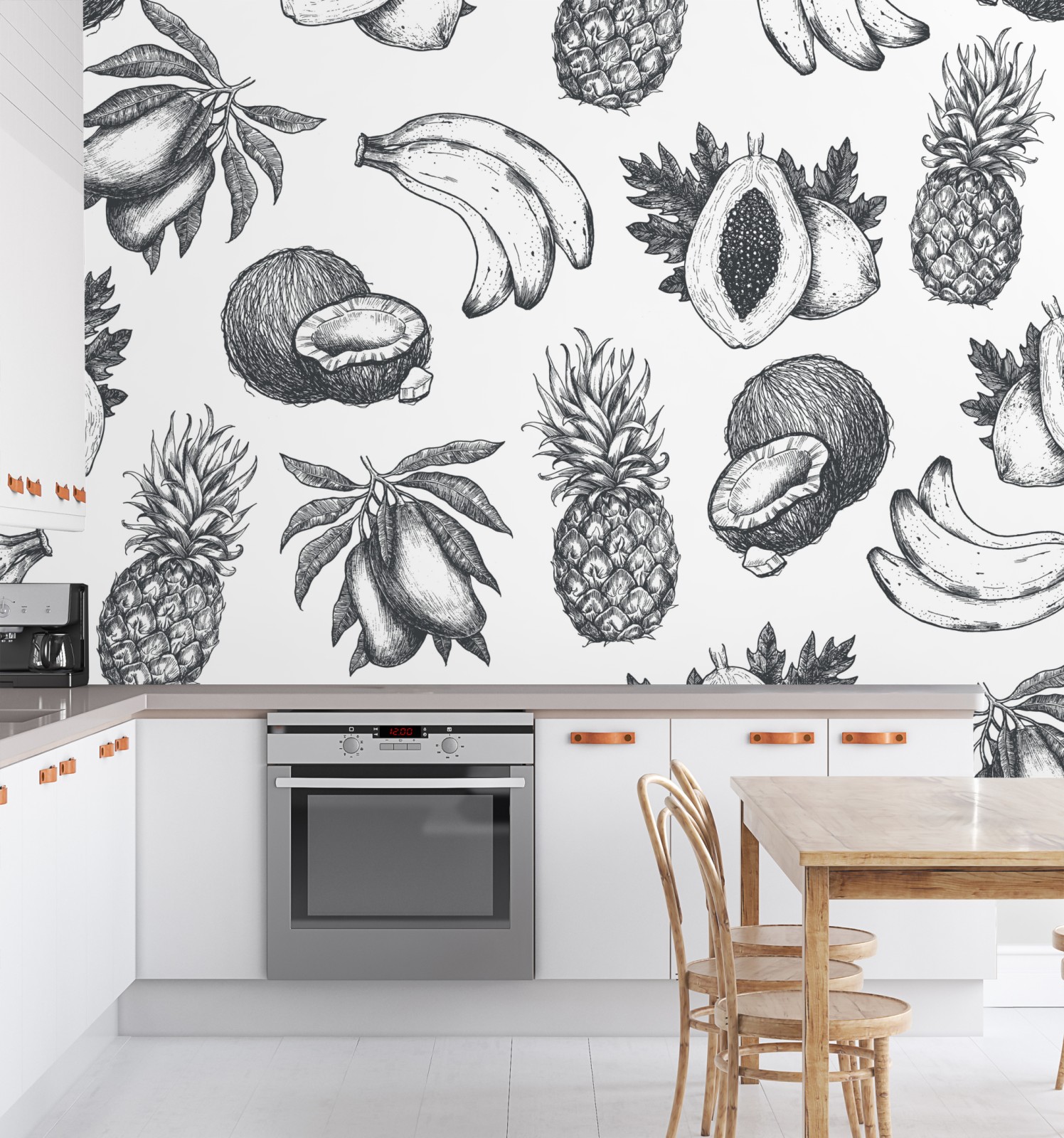 Elegantes handgezeichnetes Muster tropischer Früchte in monochromem Stil, perfekt für moderne Küche und Esszimmer.