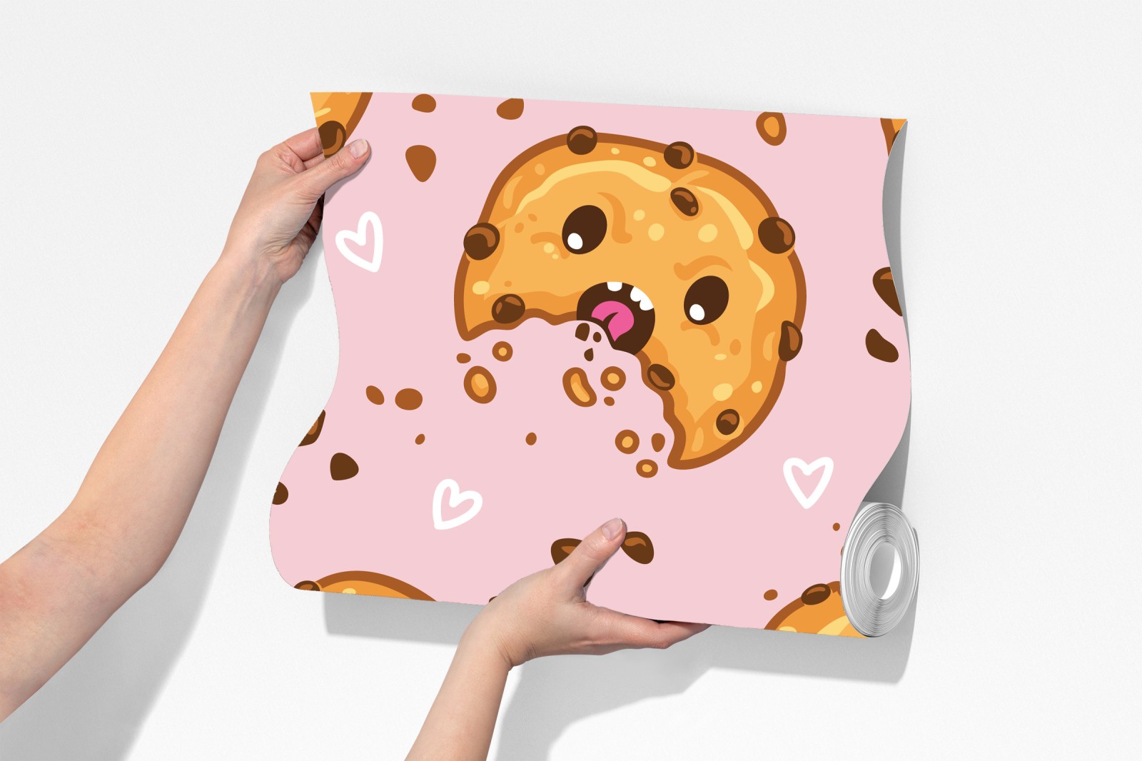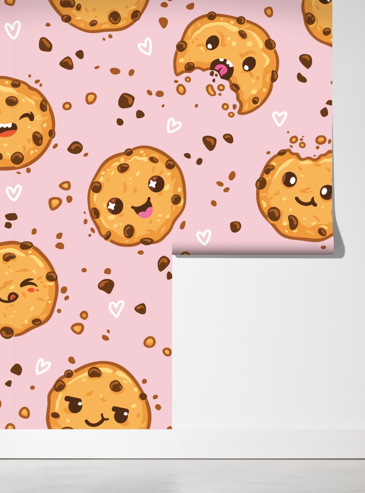 Verspieltes kawaii-schokoladenkeks-motiv auf sanftem rosa Hintergrund, ideal für Kinderzimmer und süße Dekoration.
