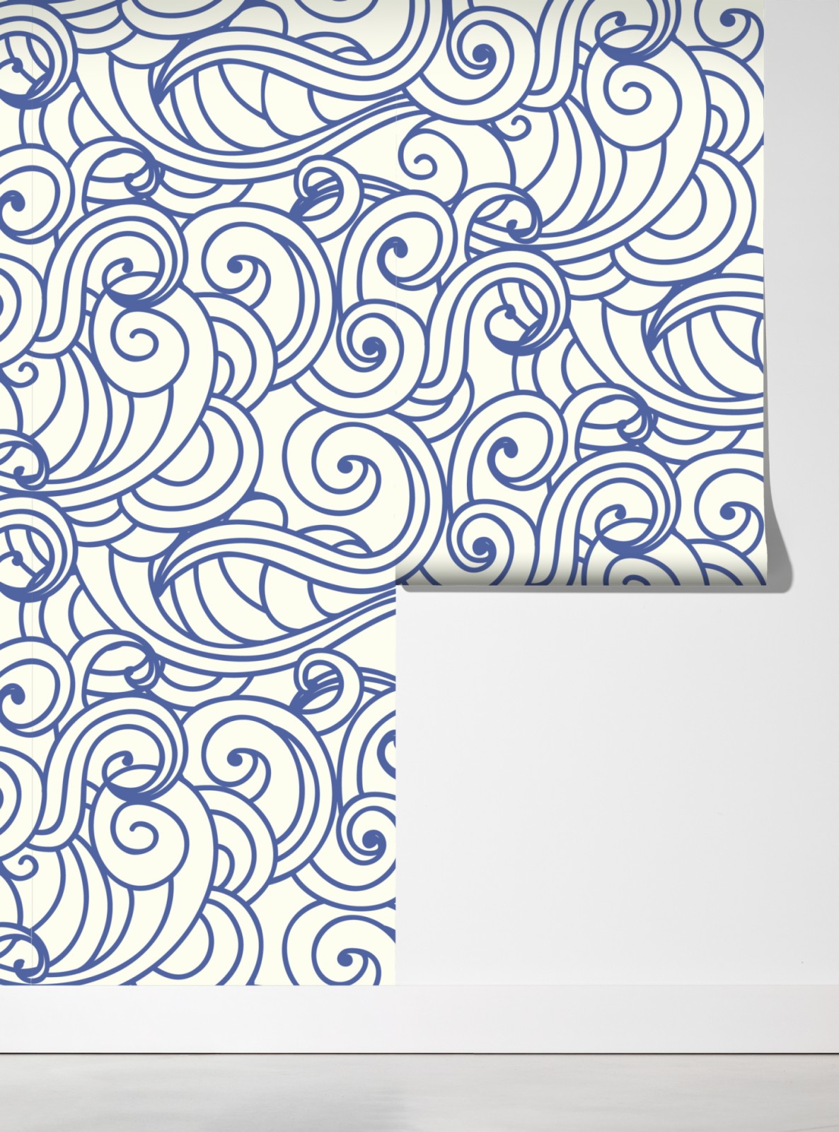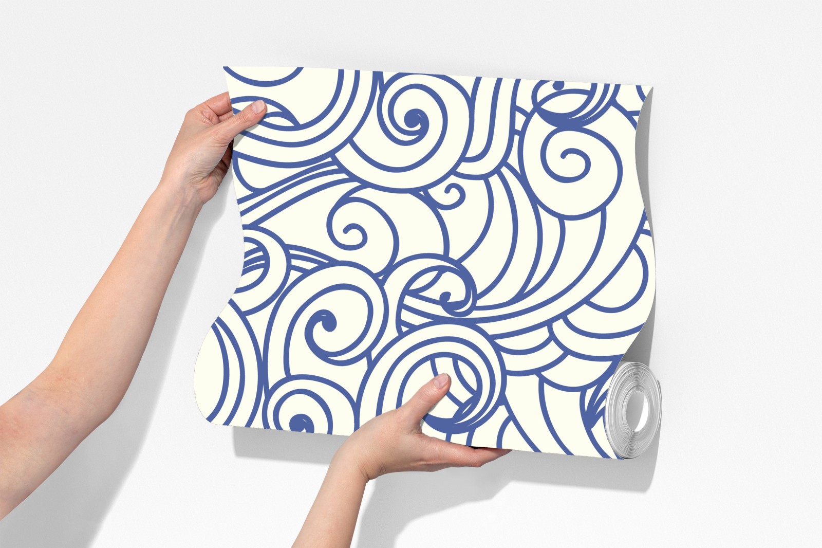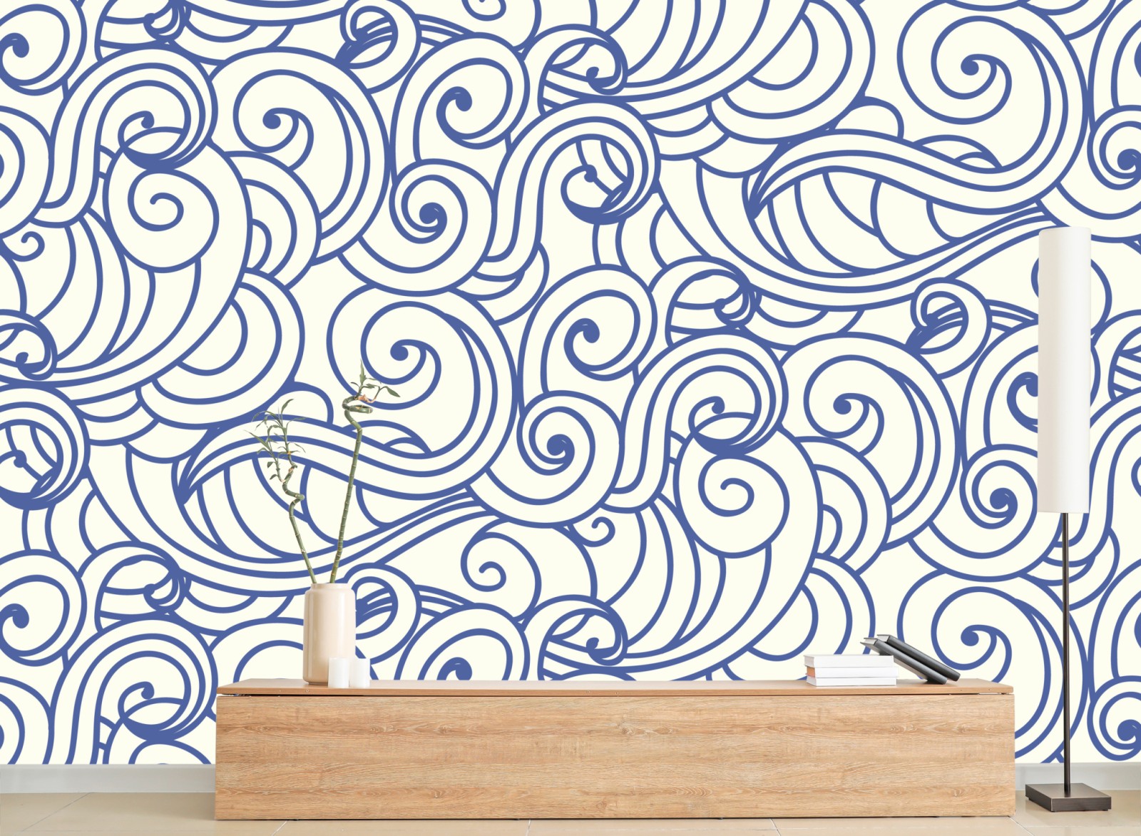 Elegantes nahtloses blaues Wirbelmuster, das eine ruhige, moderne Atmosphäre ins Interieur bringt und sich hervorragend als Wandbild oder Stoffdruck eignet.