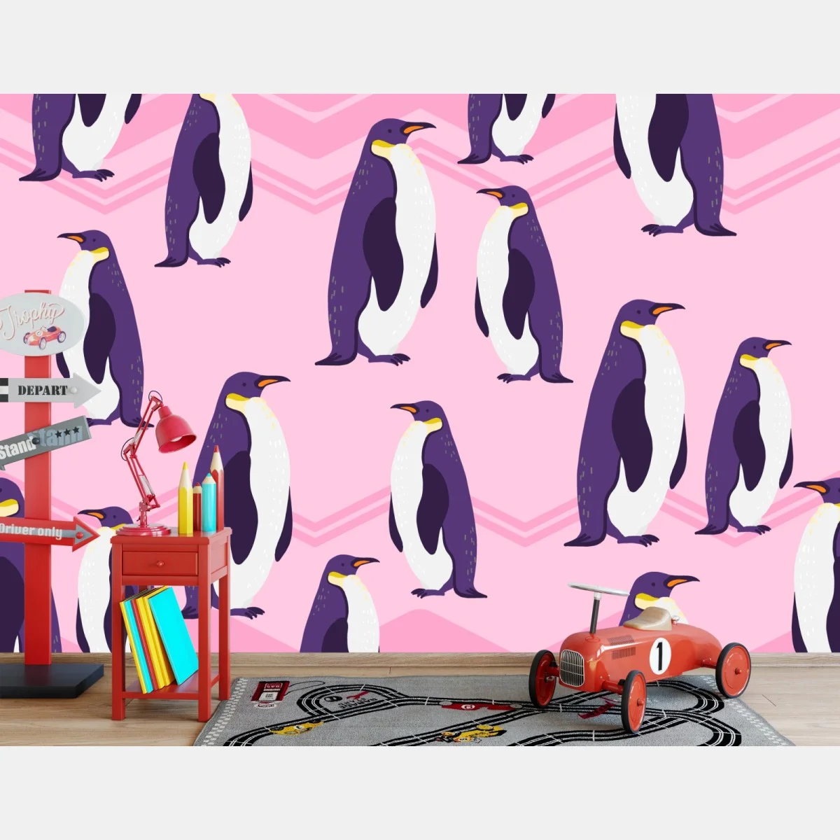 Fototapete Verspieltes muster mit violetten pinguinen auf rosa hintergrund