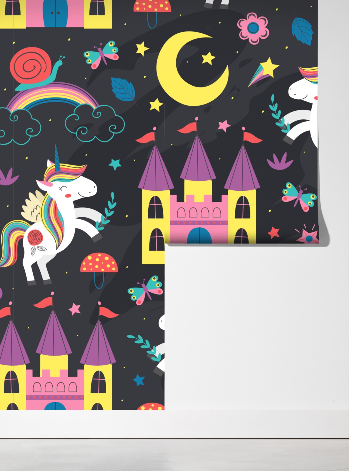 buntes und märchenhaftes muster mit einhörnern, feen, regenbögen und schlössern zur verschönerung des kinderzimmers.