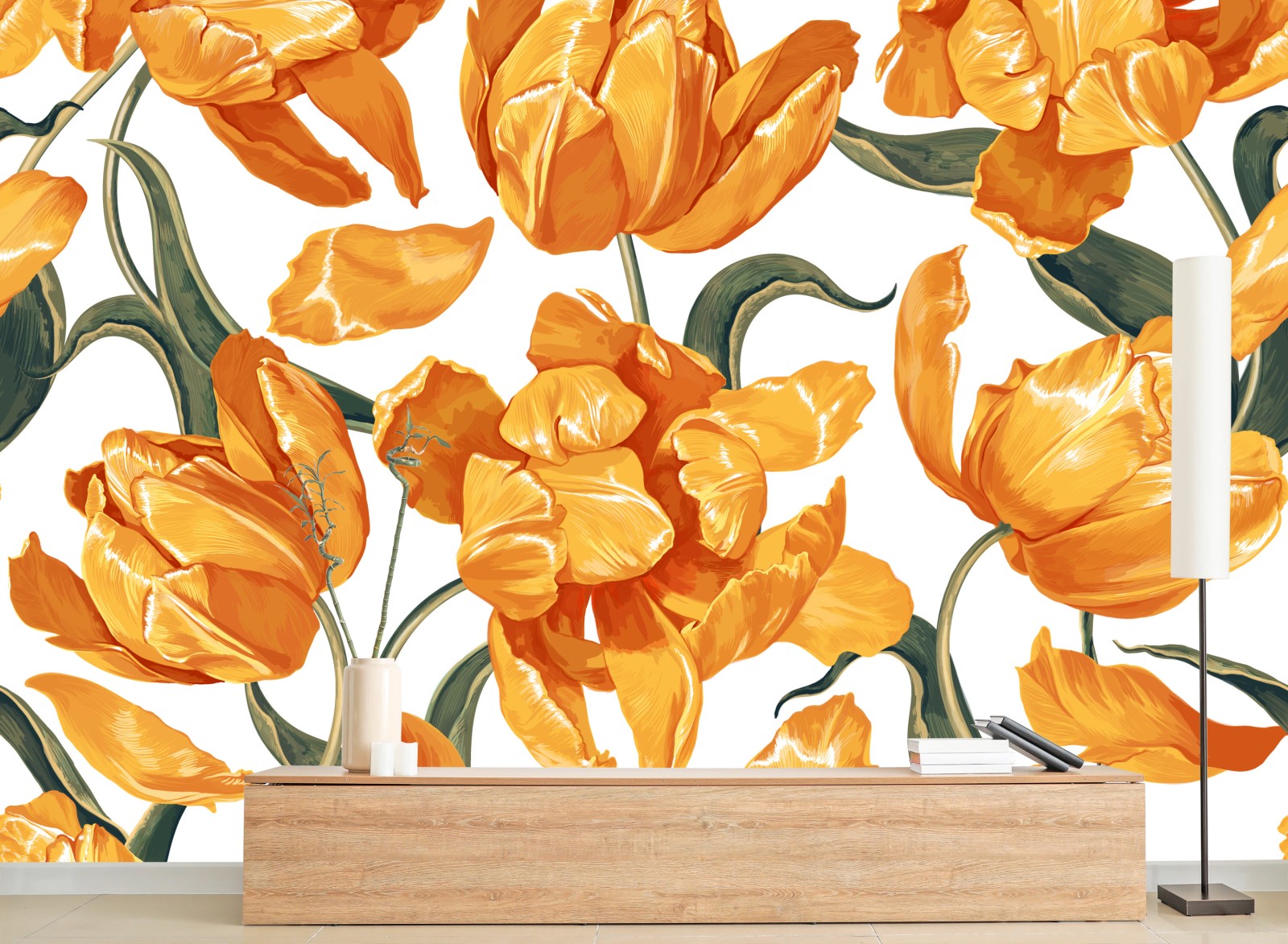 Lebhafte orangefarbene Tulpen-Illustration verleiht jedem Raum Energie und Eleganz und bringt botanischen Frühlingscharme.MehrWeniger